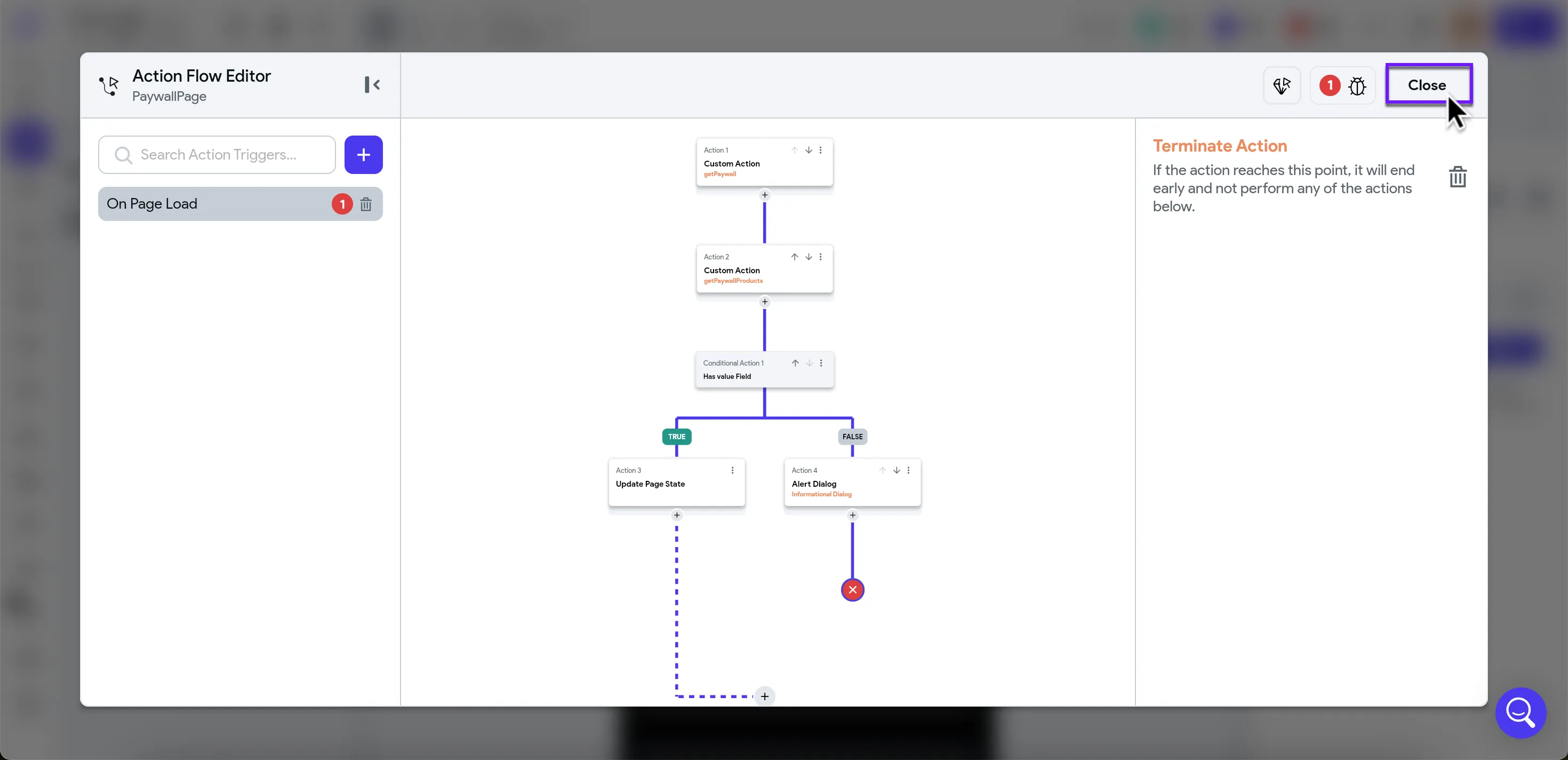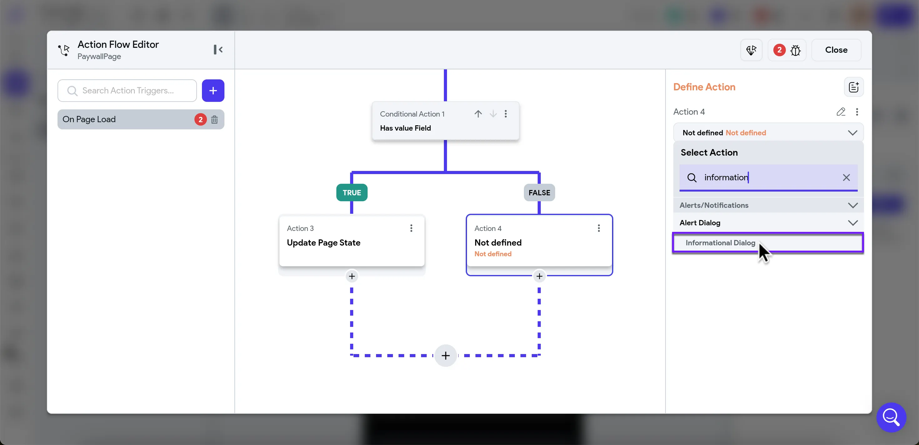 - Add an Informational Dialog action to the FALSE label.