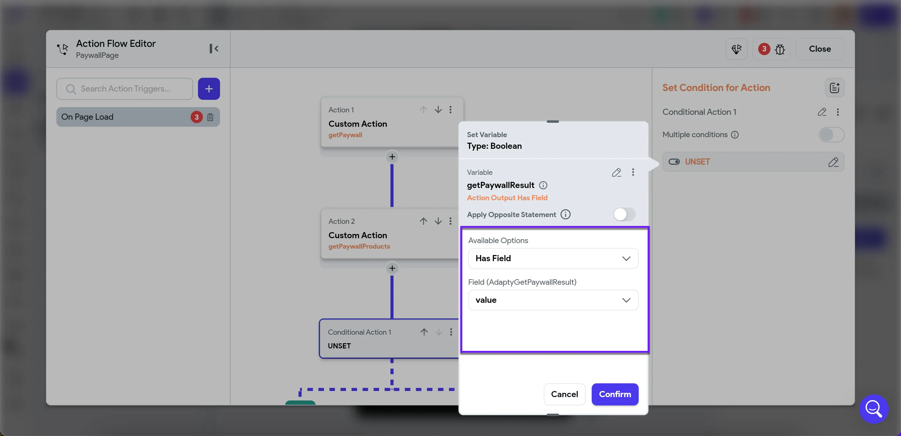 - To verify that the Adapty paywall was received, check for the presence of a field with a value. In the Available Options list, choose Has Field.