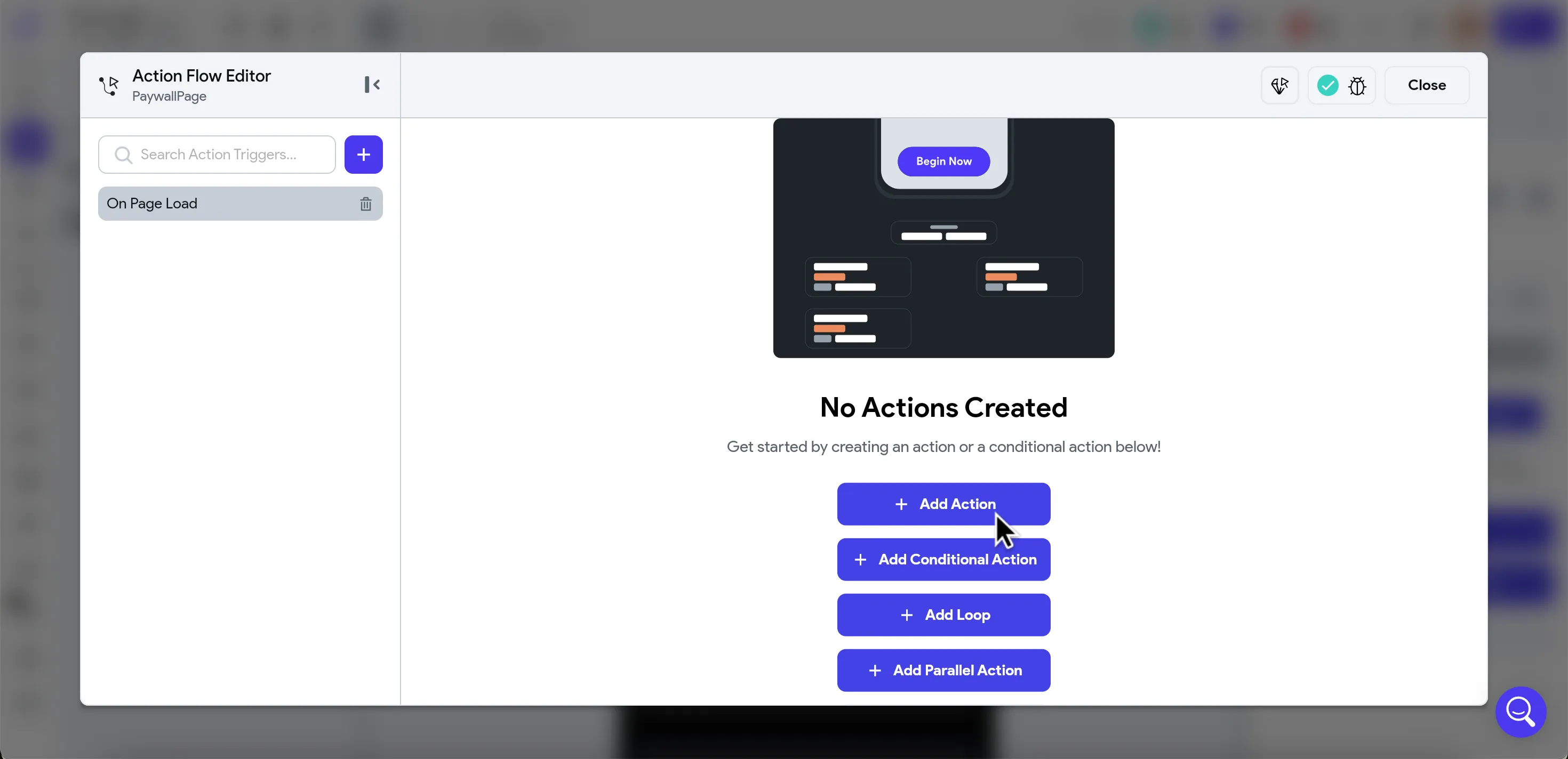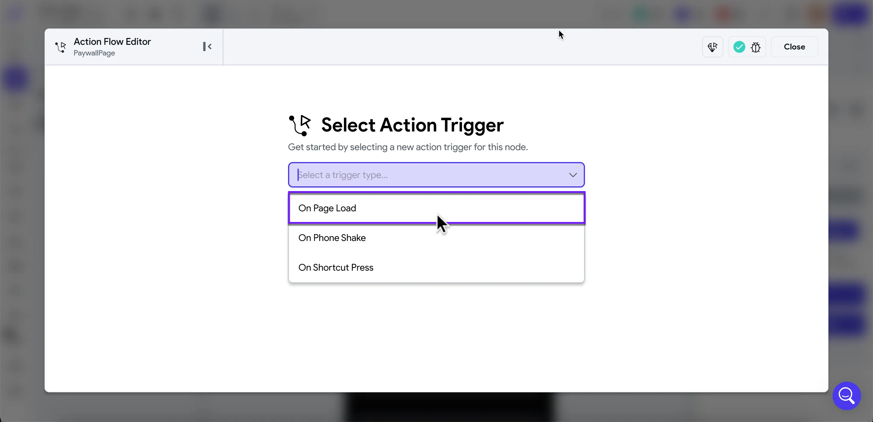 - In the Select Action Trigger window, choose On Page Load.