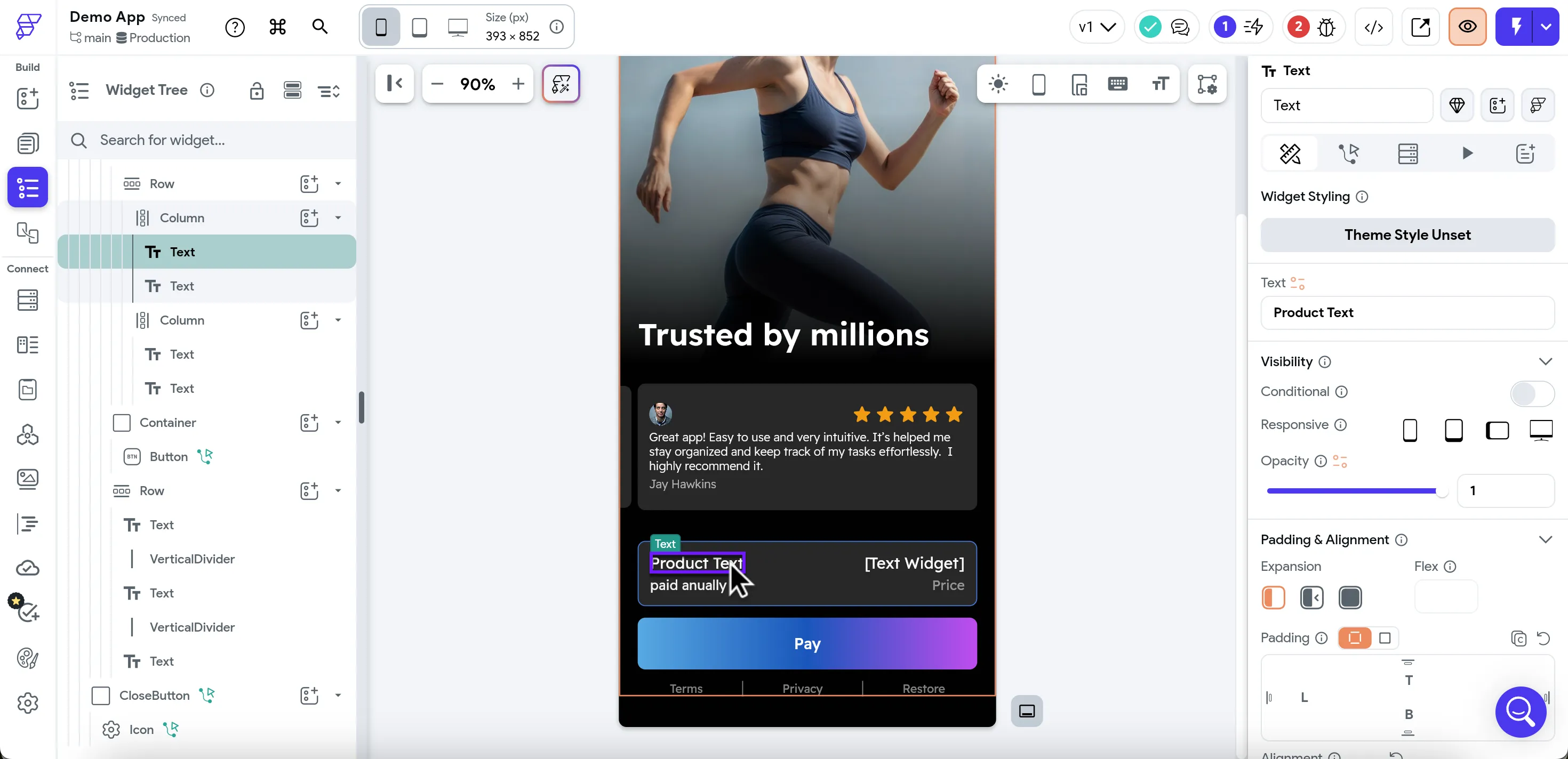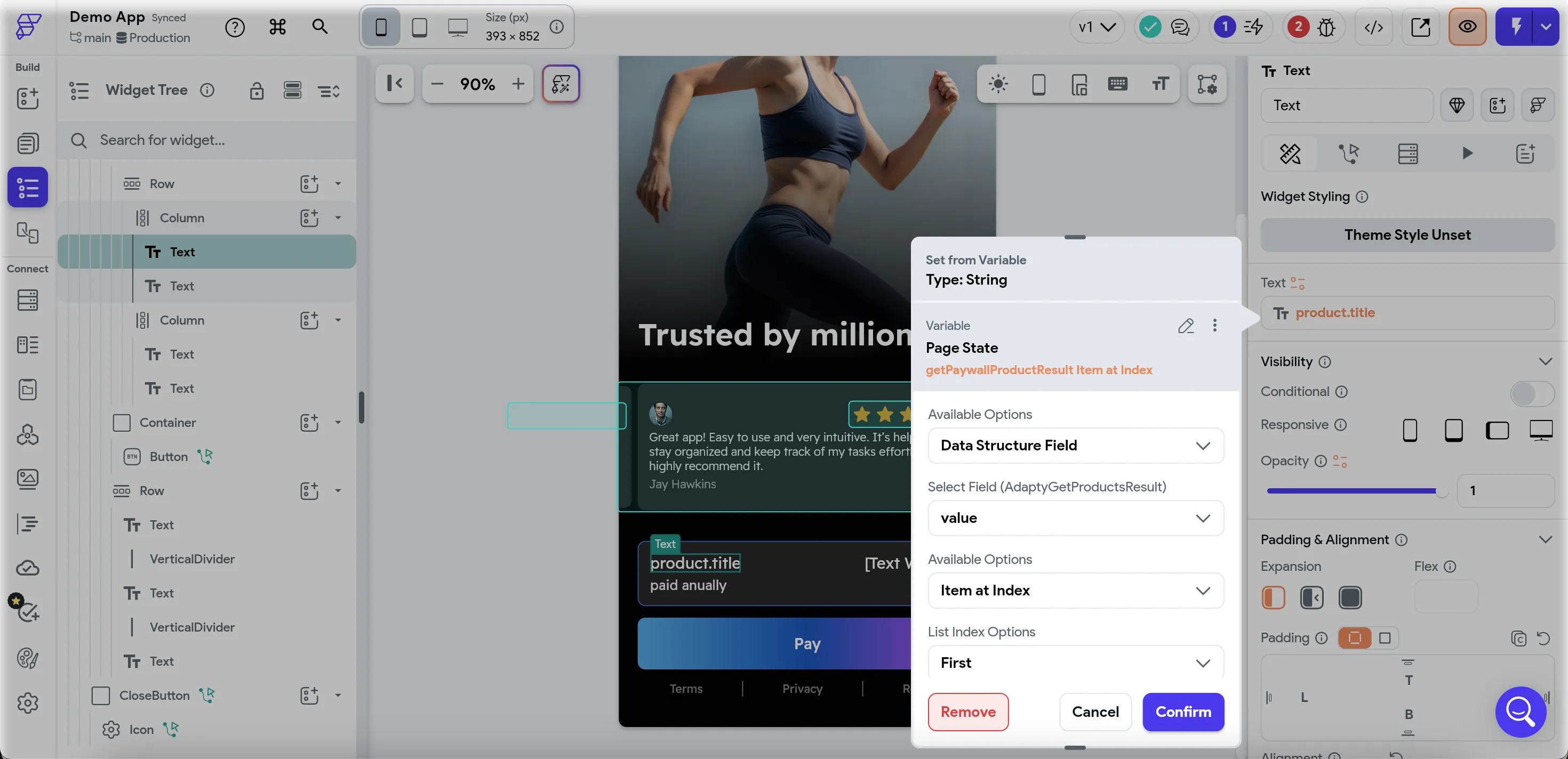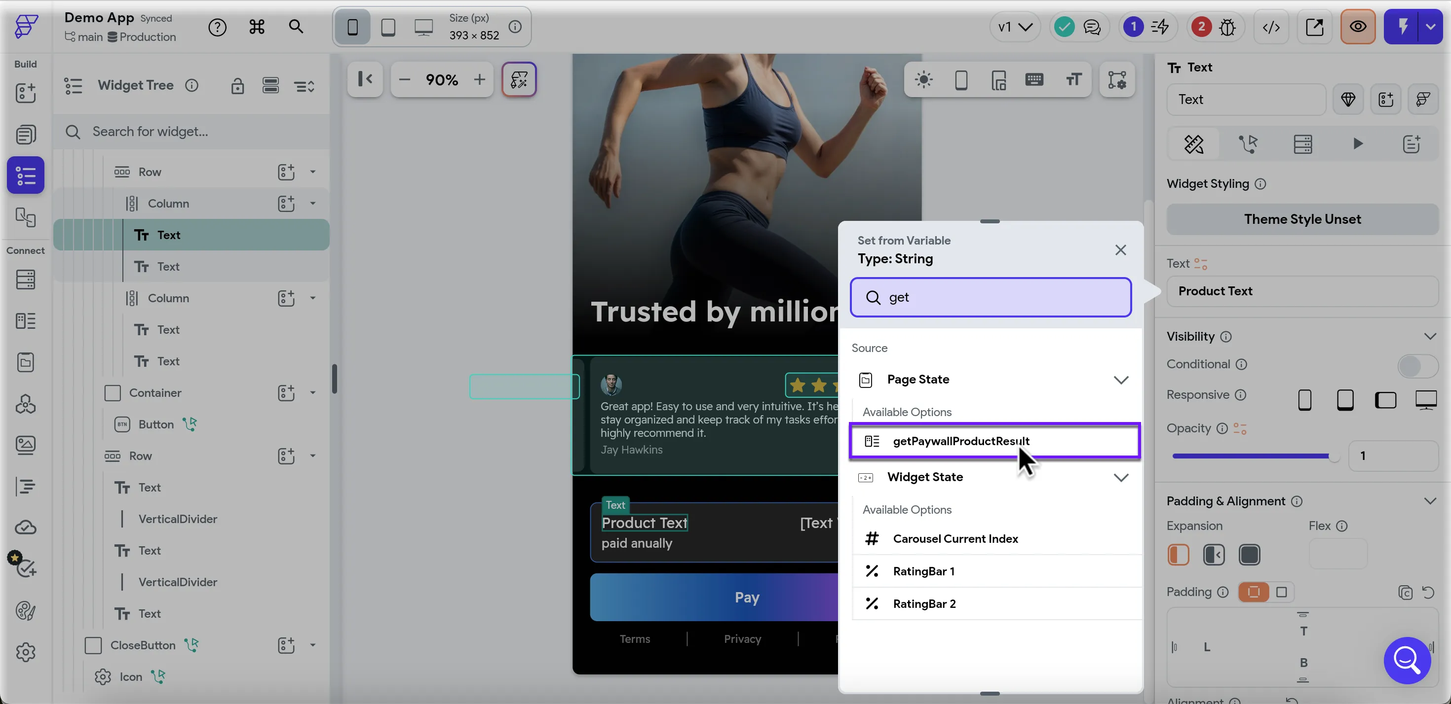 Once you've received all the necessary product data, it's time to map it to the beautiful paywall you designed in FlutterFlow. In this example, we'll map the product title and its price.