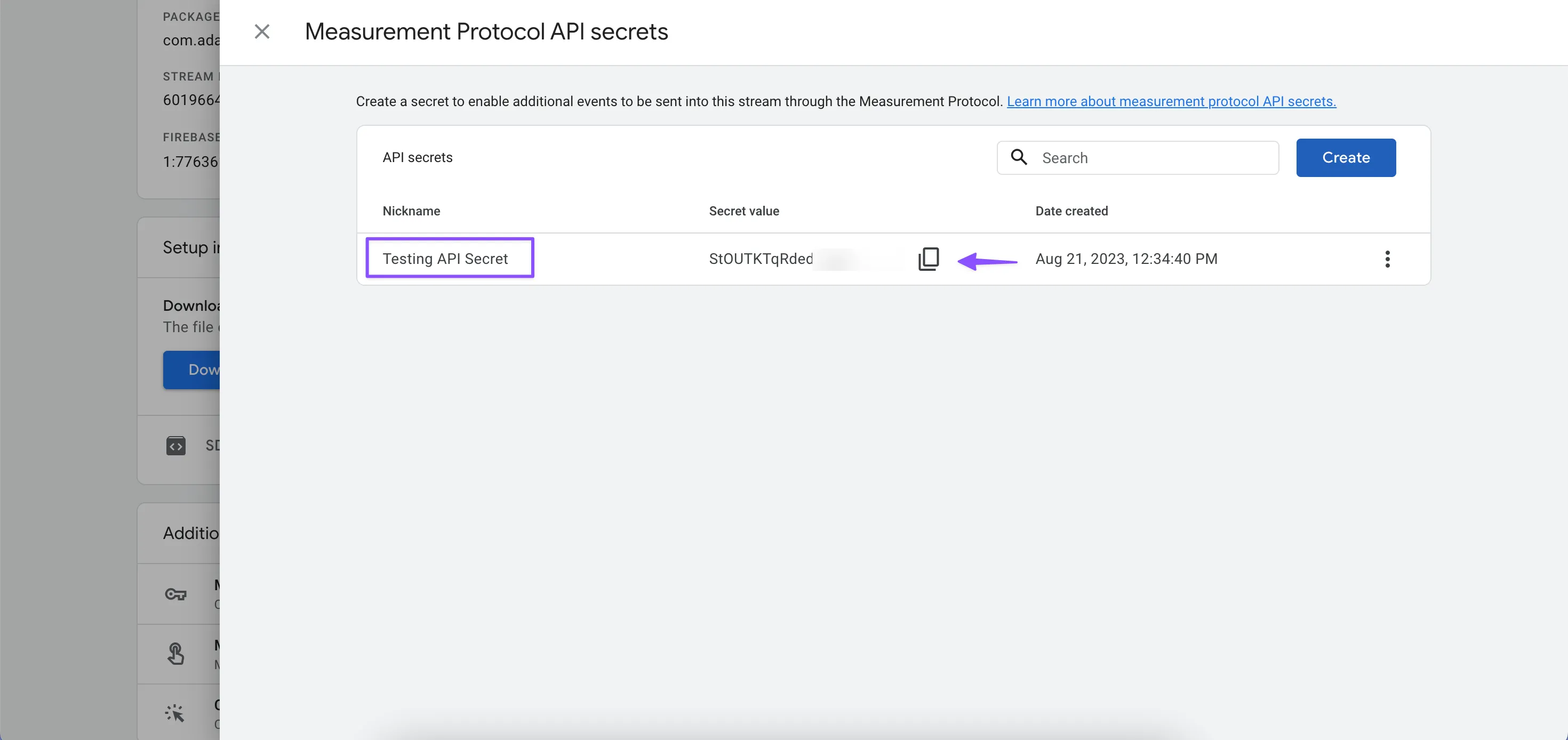 Under Additional settings, go to the Measurement Protocol API secrets page and create a new API Secret if it doesn't exist. Copy the value.