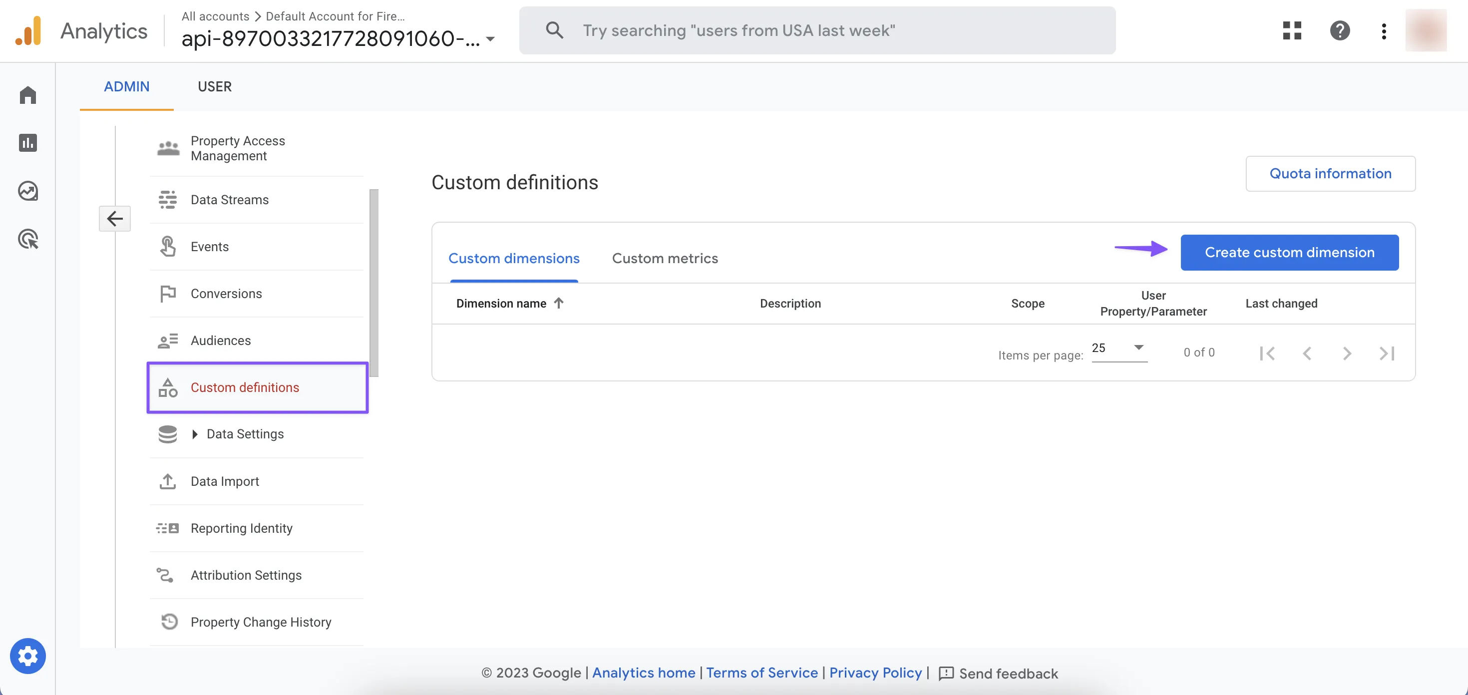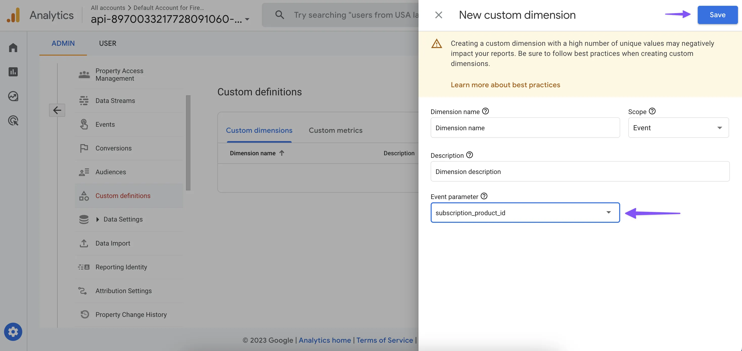 This means that your events will be enriched with subscription_state and subscription_product_id by Adapty. But you also have to enable this feature in Google Analytics. So to use User properties in your analytics, begin by assigning them to a custom dimension through the Firebase Console's Custom Definitions by selecting the User scope, naming, and describing them.
