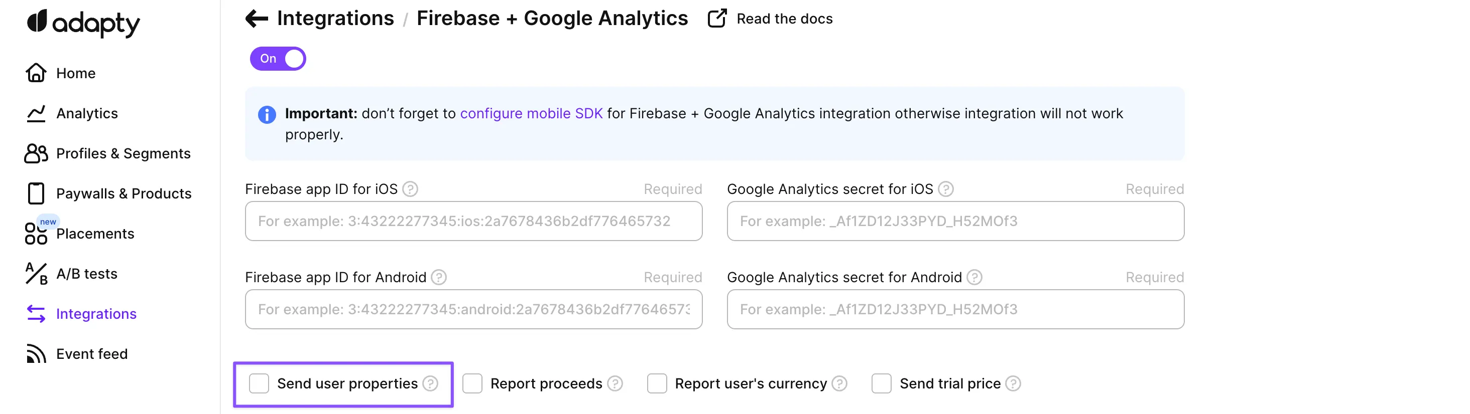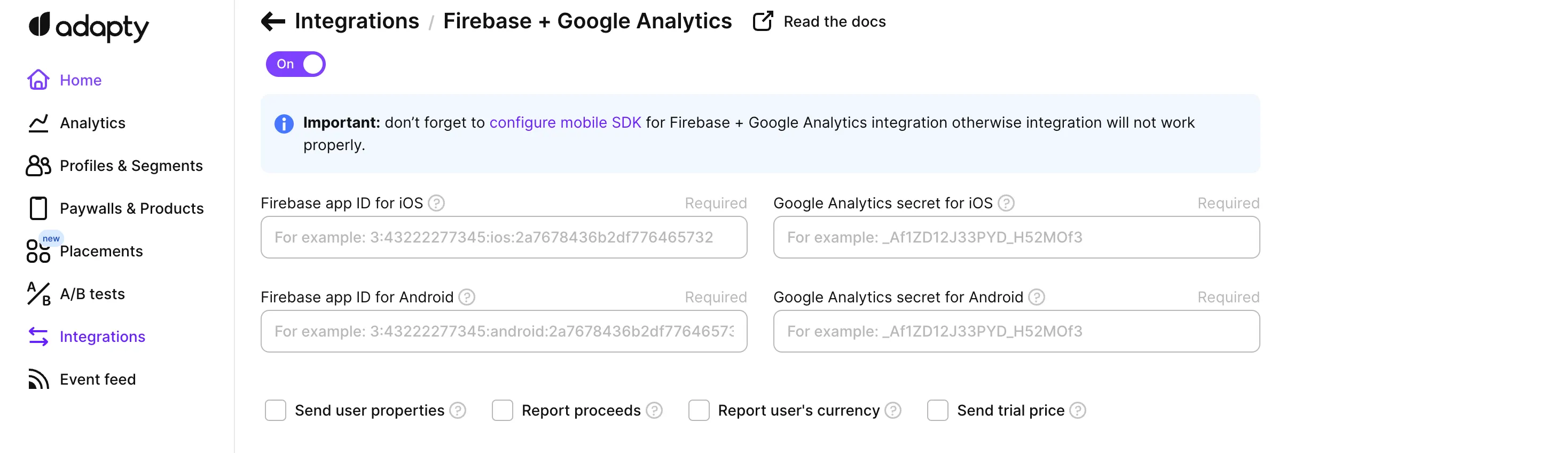 Then, your next step will be adjusting integration in Adapty Dashboard. You will need to provide Firebase App ID and Google Analytics API Secret to us for your iOS and Android platforms.