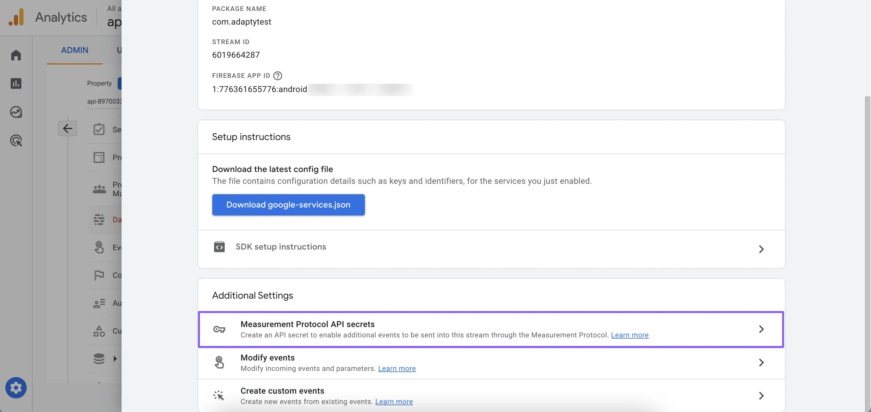 Then Adapty needs your Firebase App ID and Google Analytics API Secret to send events and user properties. You can find these parameters in the Firebase Console and Google Analytics Data Streams Tab respectively.