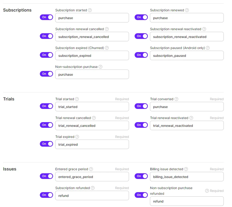 You can see that some events have designated names, for example. "Purchase", while other ones are usual Adapty events. This discrepancy comes from Google Analytics event types. Currently, supported events are Refund and Purchase. Other events are custom events. So, please ensure that your event names are supported by Google Analytics.