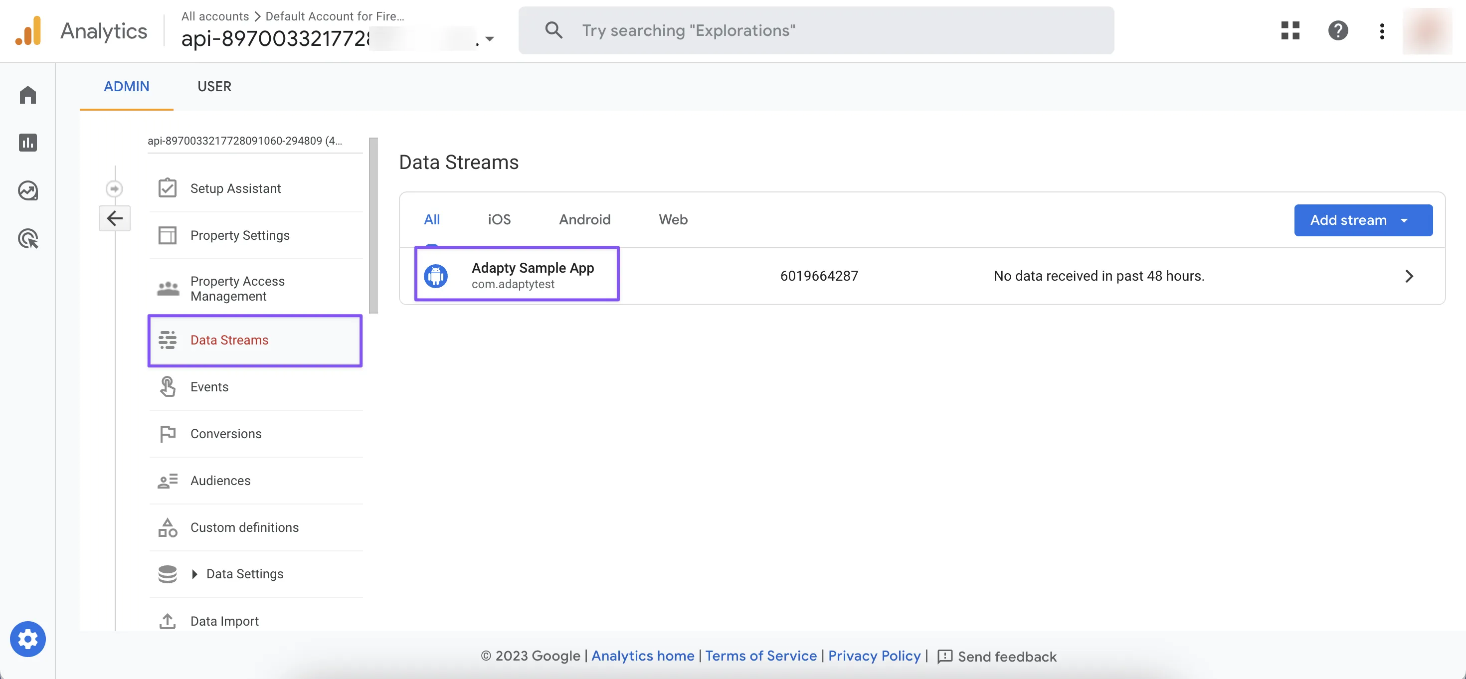 Next, access the App's Stream details page within the Data Streams section of Admin settings in Google Analytics.