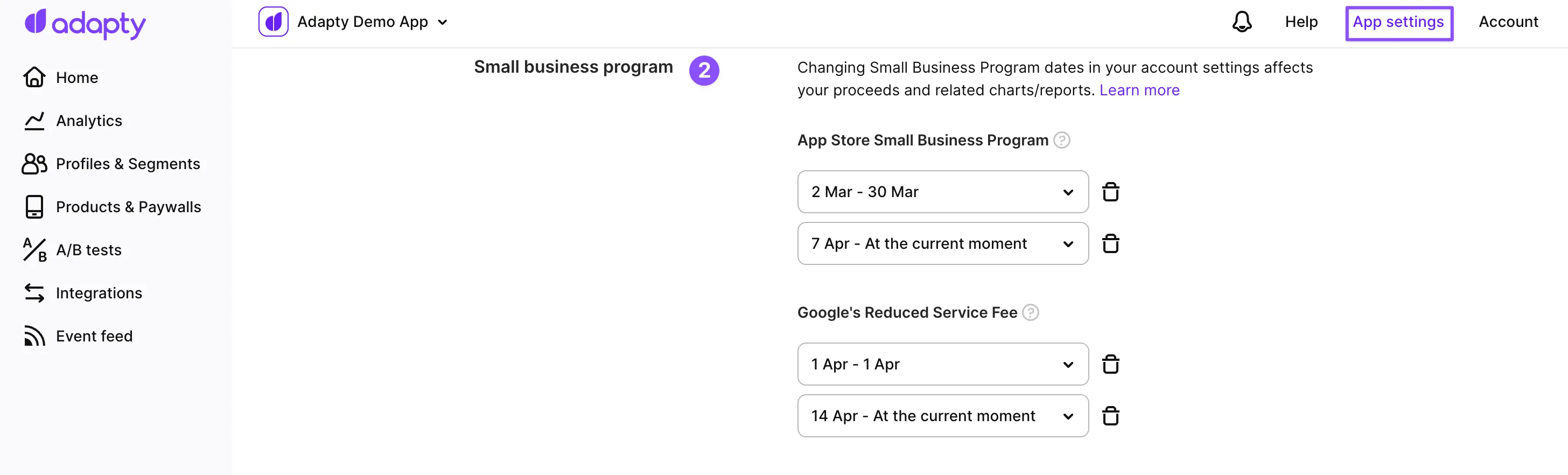 If you're a member of the Apple Small Business Program and/or Google's Reduced Service Fee program, you can let Adapty know by specifying the period that you are a member. Adapty will adjust the commission rate accordingly, so you can keep more of your revenue. Please note that this setting applies only to future transactions, and you need to update it if your Small Business Program status changes. You can learn more about the App Store Small Business Program and Google's Reduced Service Fee.
