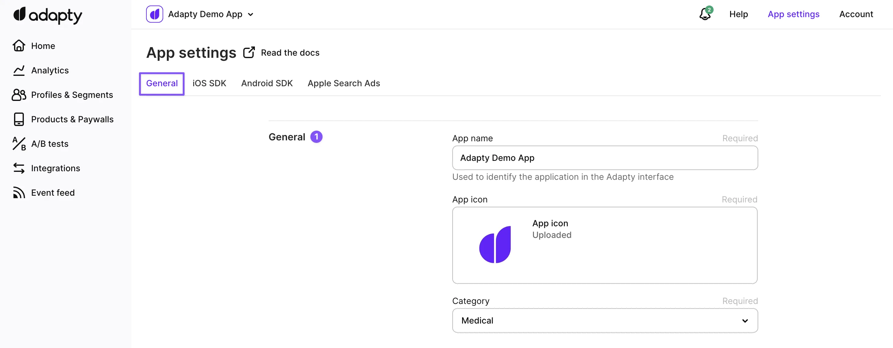 You can navigate to the General tab of the App Settings page to manage your app's behavior, appearance, and revenue sharing. Here, you can customize your app's name and icon, manage your Adapty SDK and API keys, set your Small Business Program status, and choose the timezone for your app's analytics and charts.