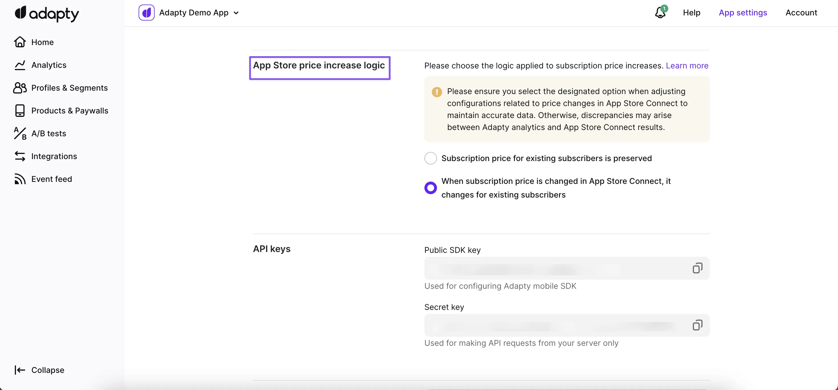 Use a Public SDK key to integrate Adapty SDKs into your app, and a Secret Key to access Adapty's Server API. You can generate new keys or revoke existing ones as needed.