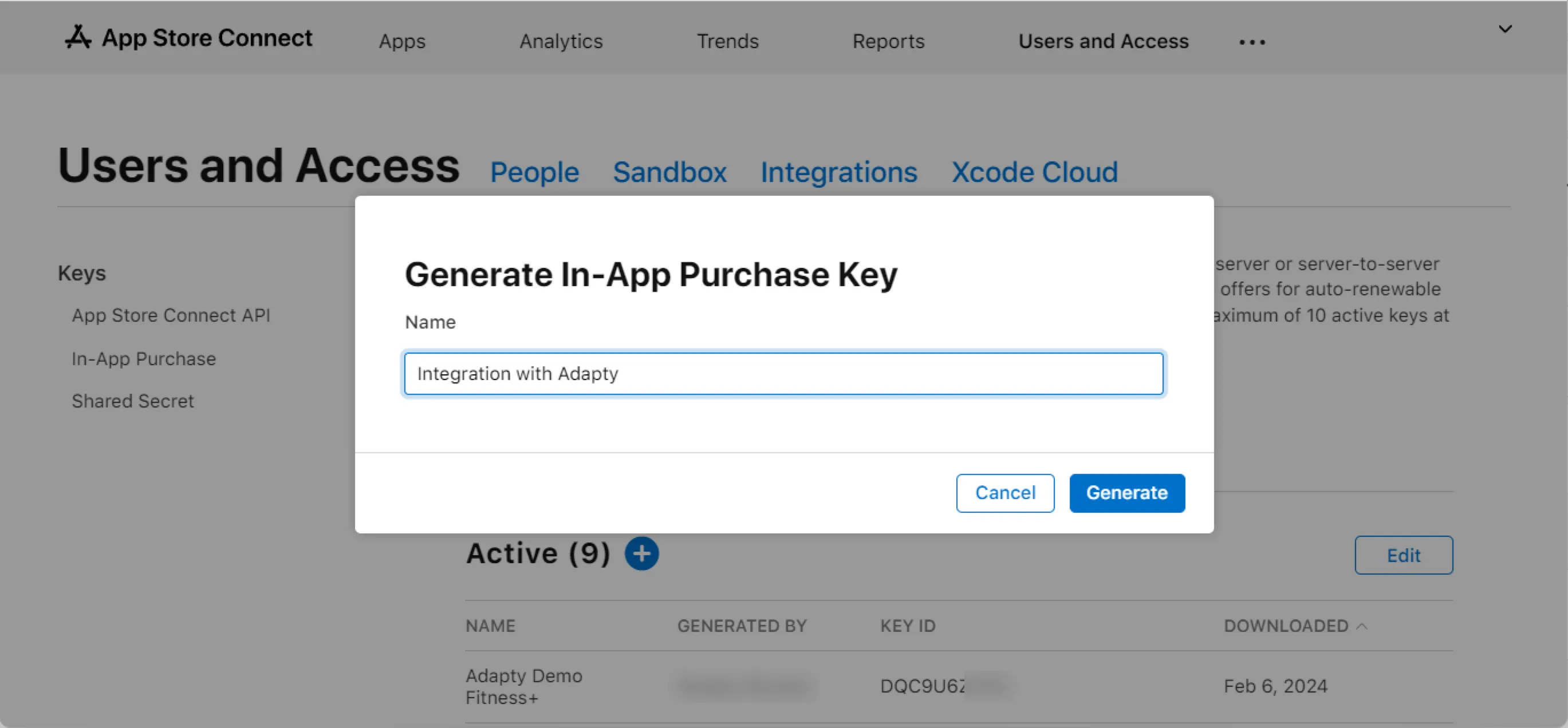 In the opened Generate In-App Purchase Key window, enter the name of the key for your future reference. It will not be used in Adapty.