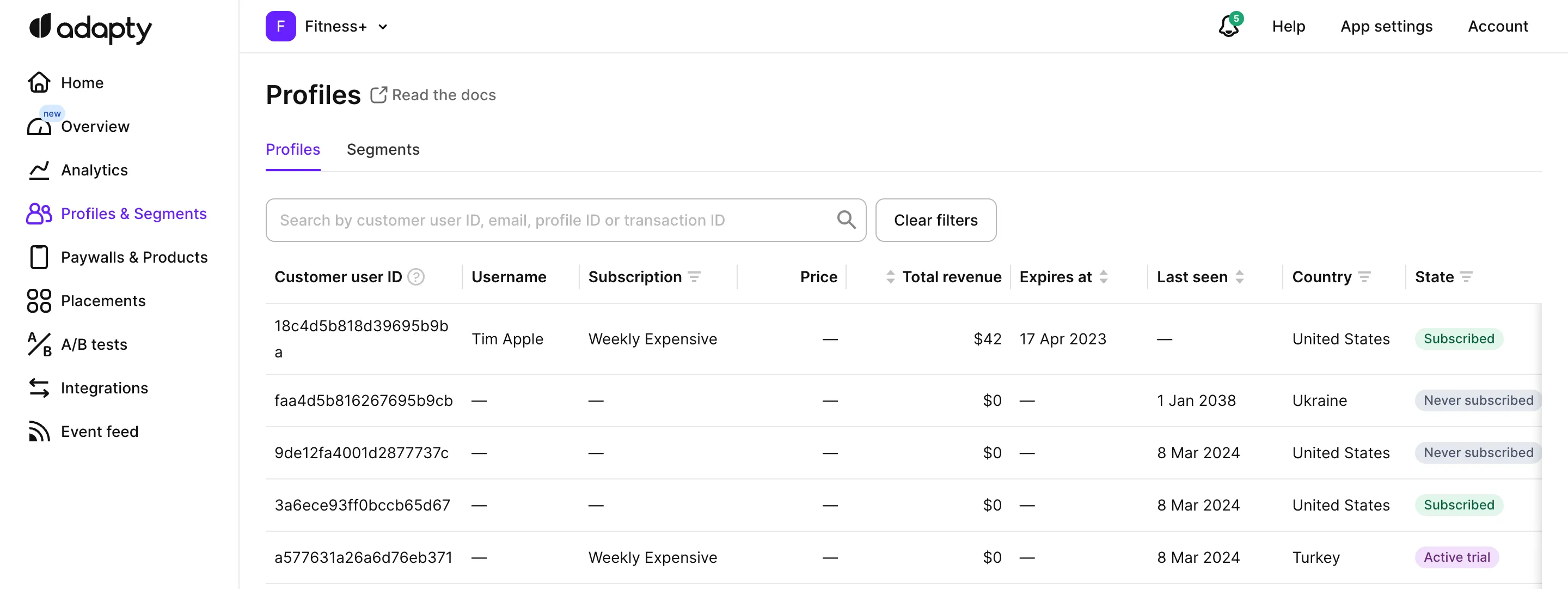 Open the Profiles and Segments section from the Adapty main menu, then select the Profiles tab.