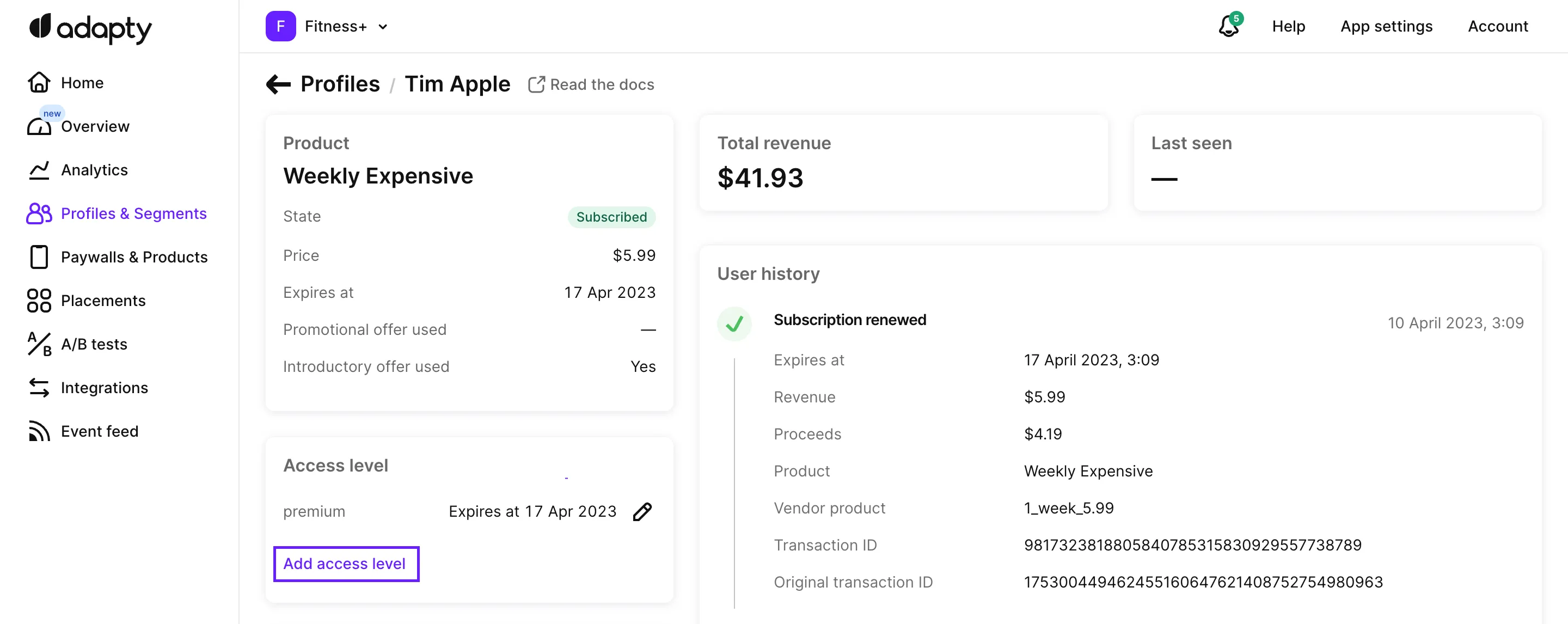 You can manually adjust the access level for a particular customer right in the Adapty Dashboard. This is useful, especially in support scenarios. For example, if you'd like to extend a user's premium usage by an extra week as a thank-you for leaving a fantastic review.