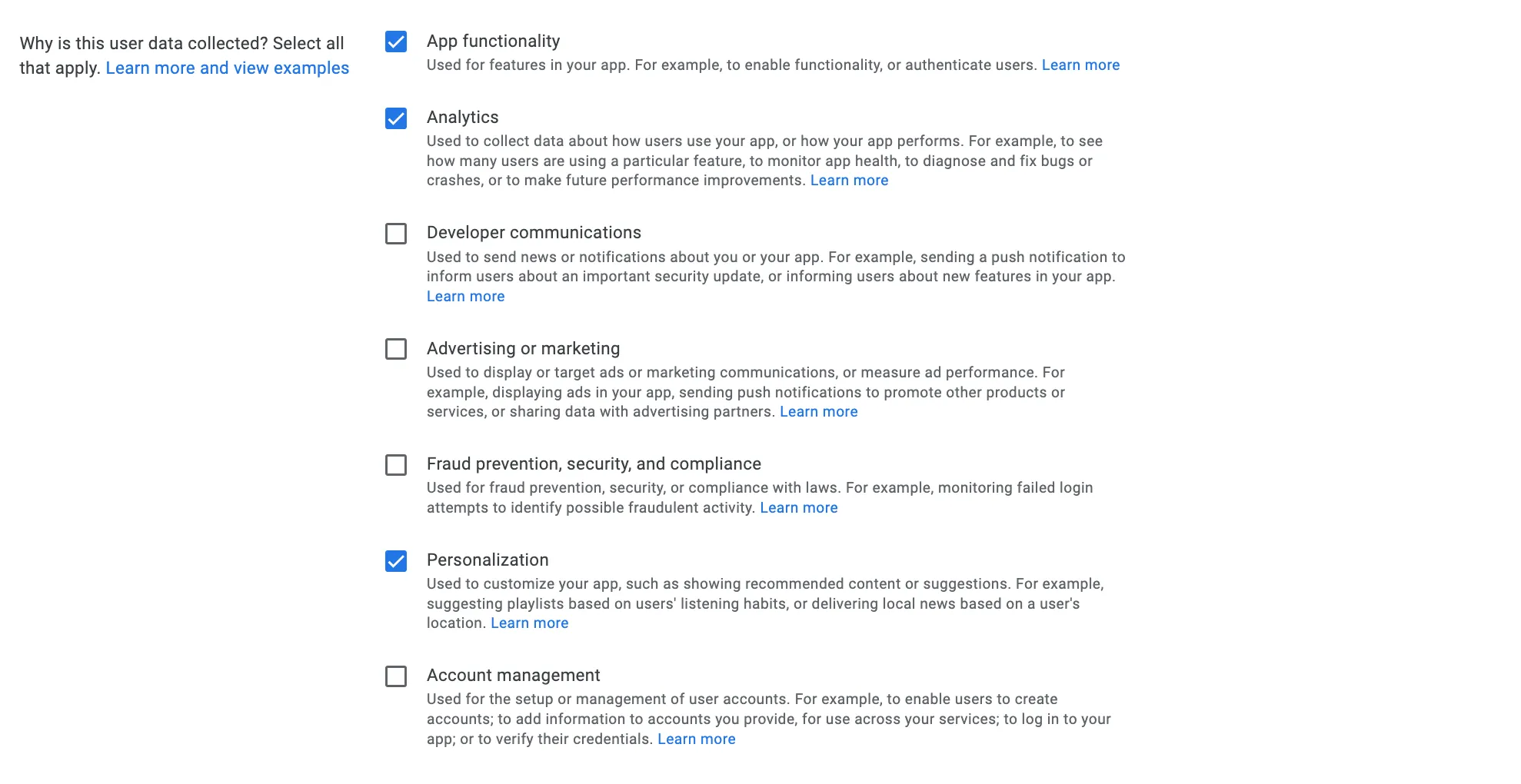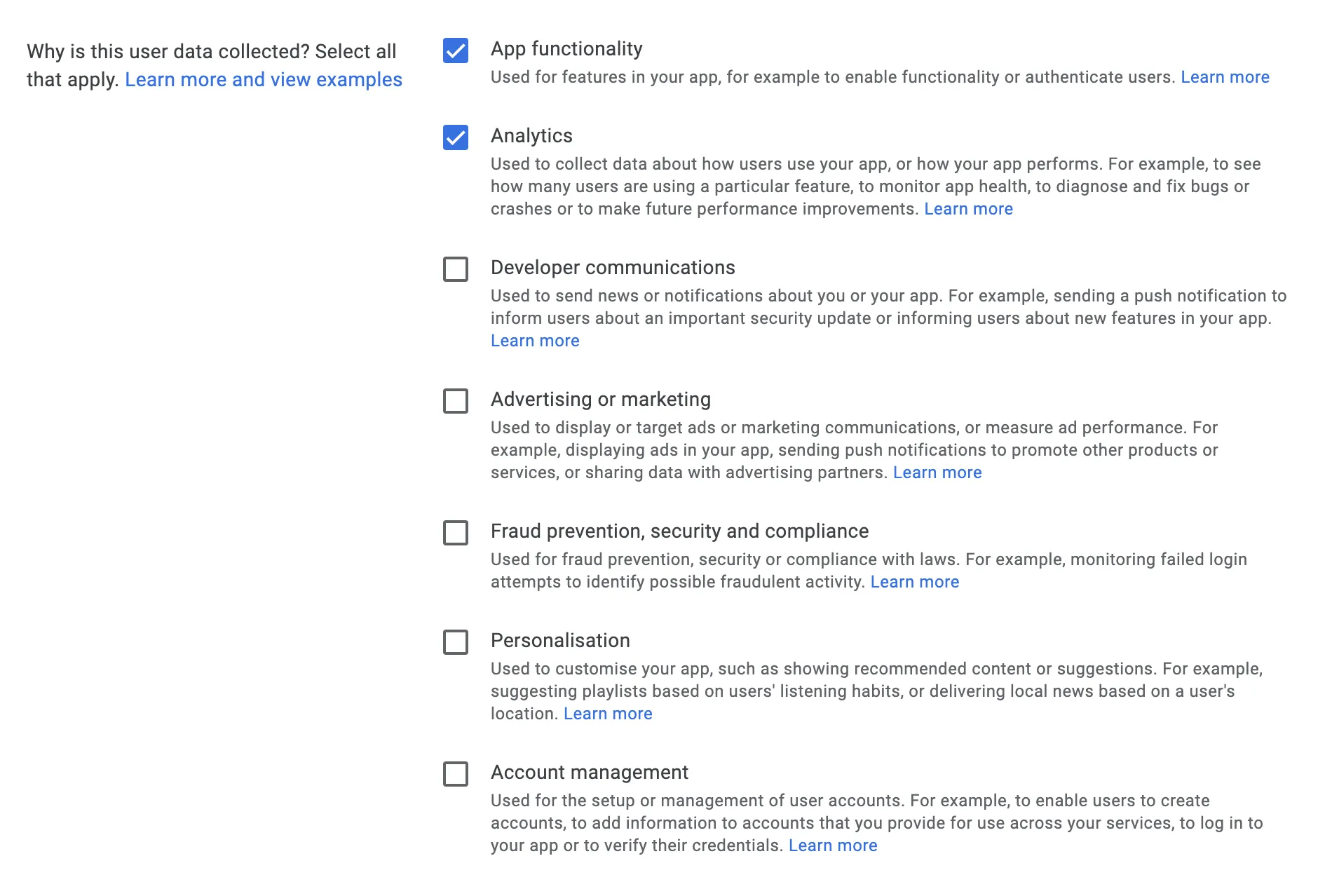 Select the 'App functionality' and 'Analytics' checkboxes.