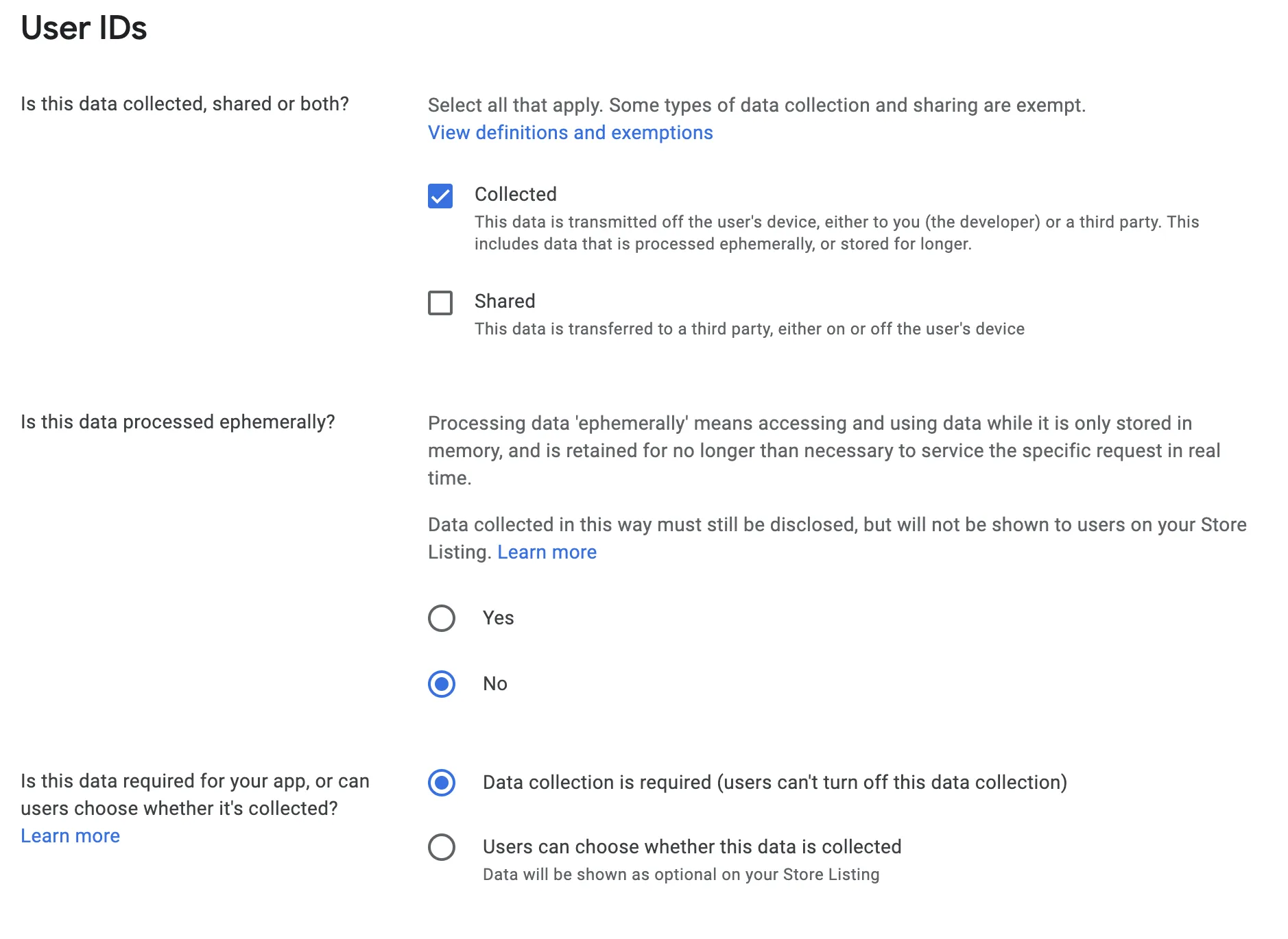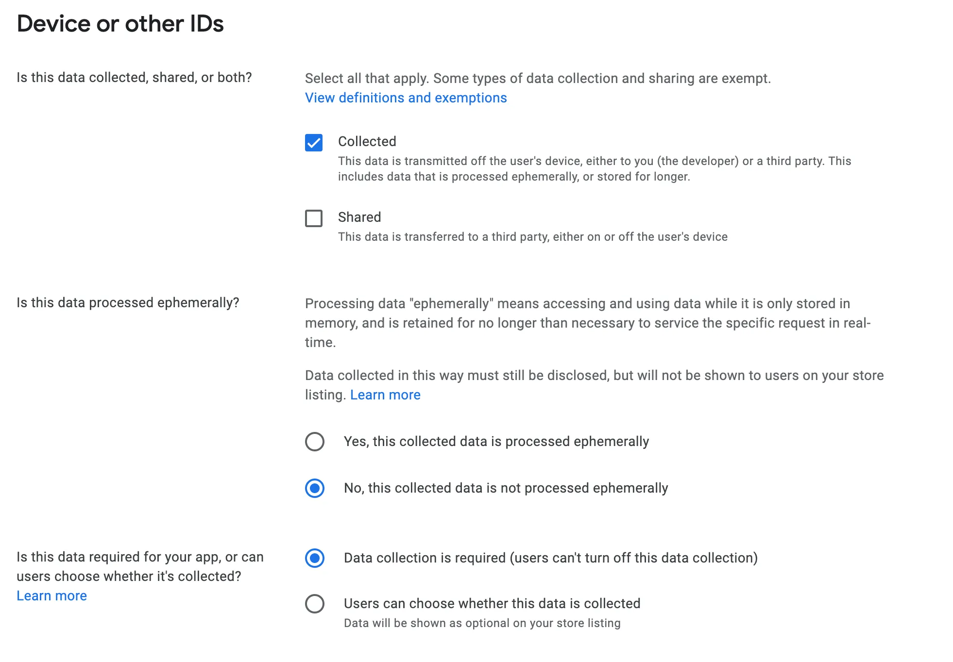 Here is a list of the data types that Google requires for reporting, and we have specified whether Adapty collects any particular type of data.