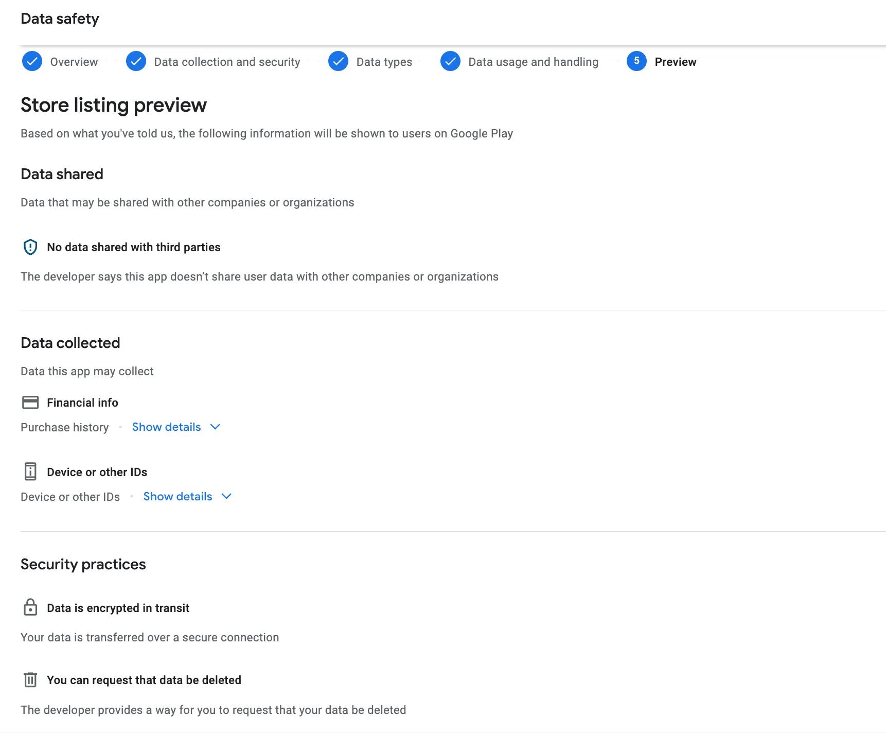 Once you have made your data safety selections, Google will display a preview of your app's privacy section. If you have opted for "Financial Info" and "Device or other IDs" as mentioned earlier, your privacy information should appear similar to the following example