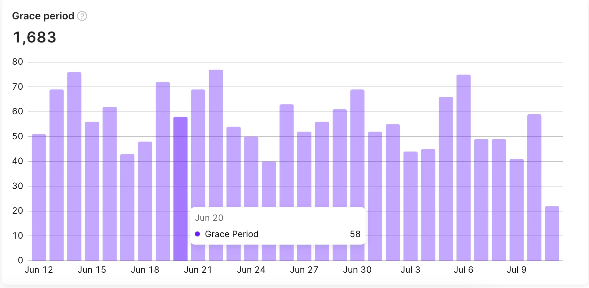 The Grace period chart displays the number of subscriptions that have entered the grace period state due to a billing issue. During this period, the subscription remains active while the store tries to receive payment from the subscriber. If payment is not successfully received before the grace period ends, the subscription enters the billing issue state.