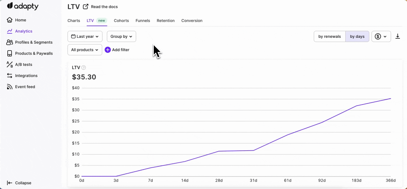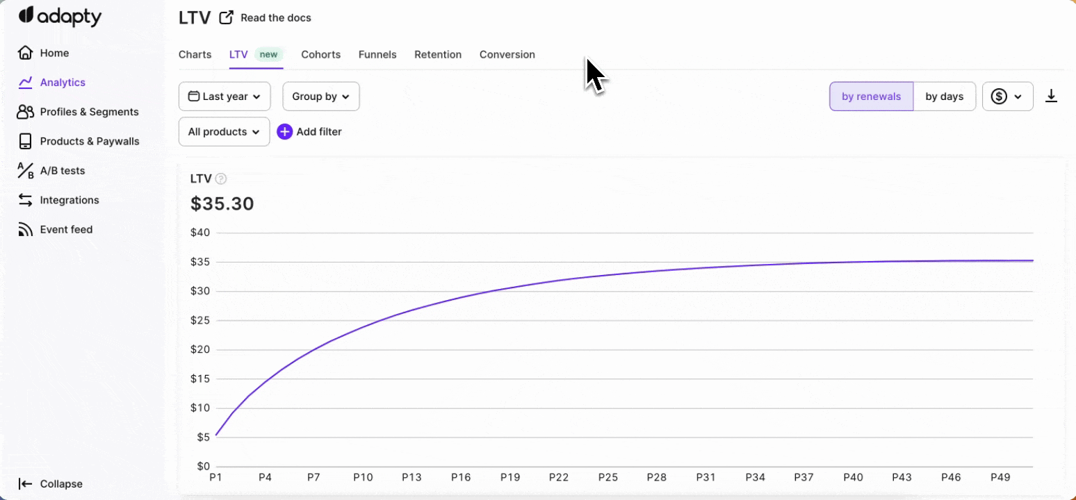 The LTV chart is a valuable tool in Adapty that provides insights into the long-term value of your customers. By analyzing customer behavior and purchase patterns over time, the LTV chart helps you understand the revenue generated by different customer segments or cohorts.
