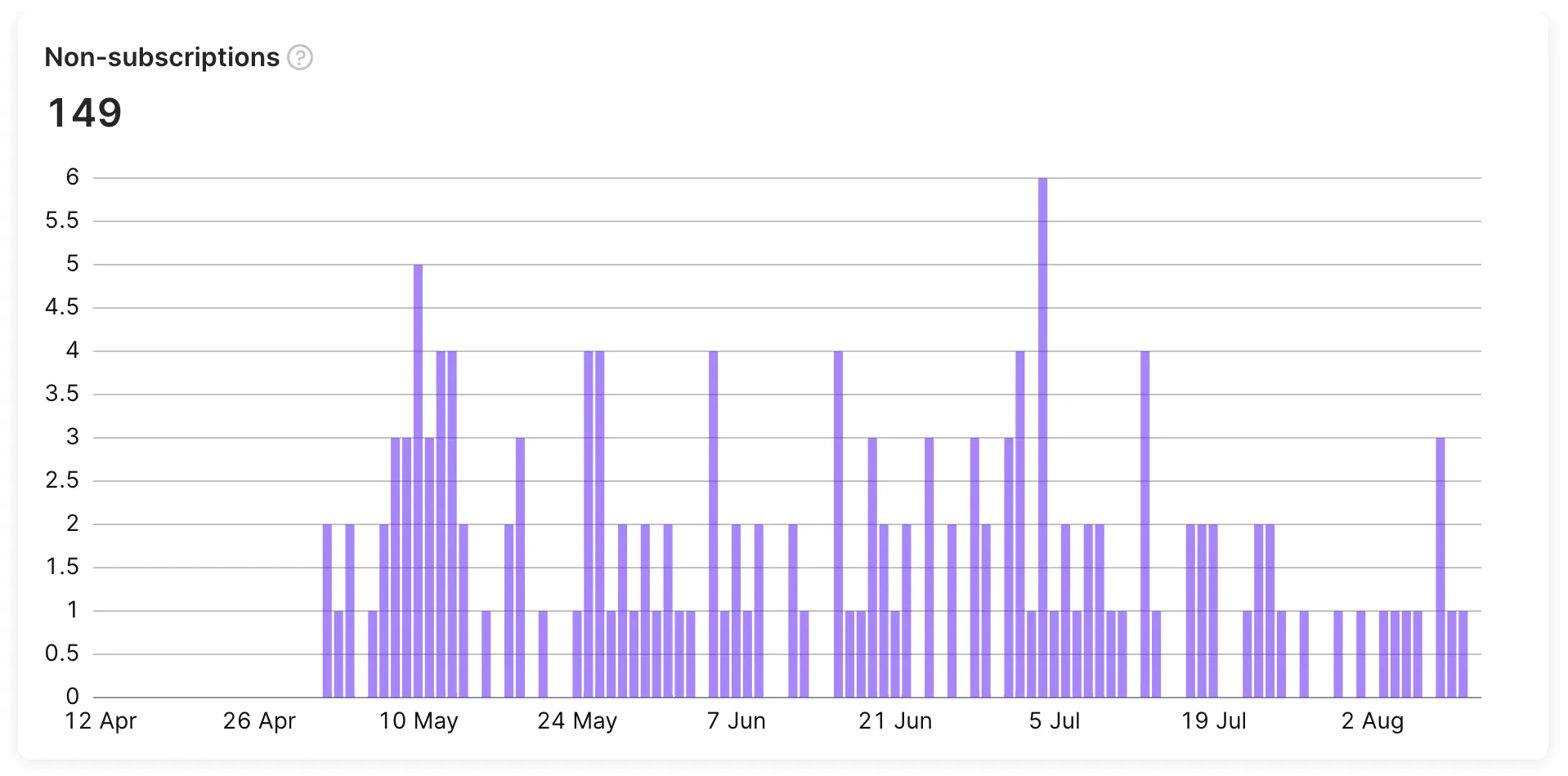 The Non-subscriptions chart displays the number of in-app purchases such as consumables, non-consumables, and non-renewing subscriptions. The chart doesn't include renewable payments. The chart shows the total count of these types of in-app purchases and can help you track user behavior and engagement over time.