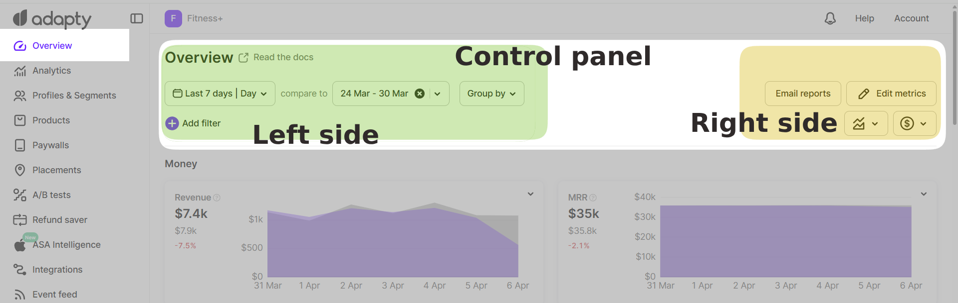 Overview is a section of the Adapty dashboard that provides analytical information through various chart views. This section includes the following parts: