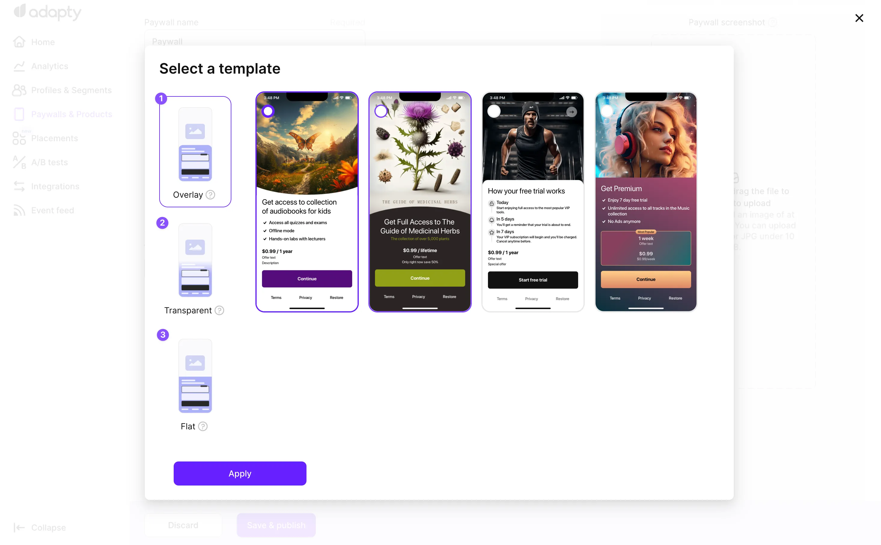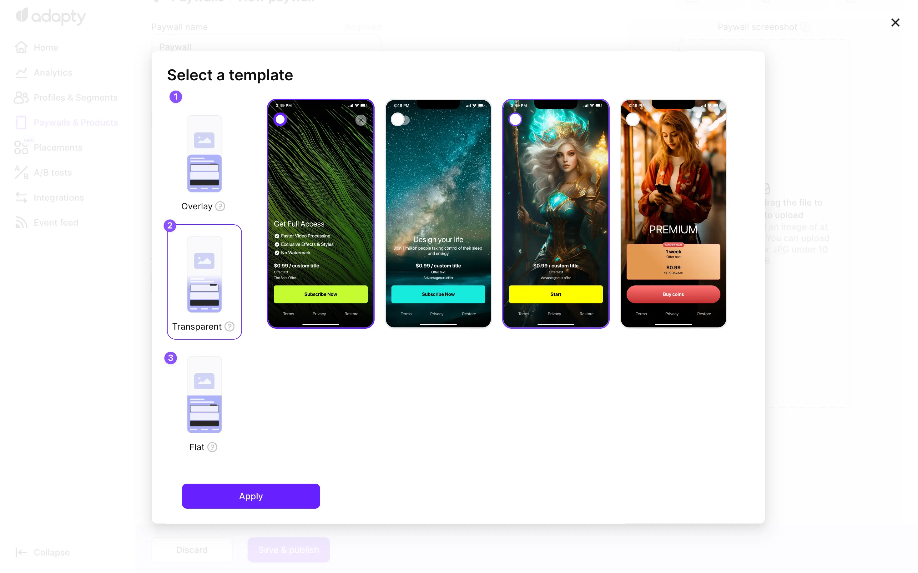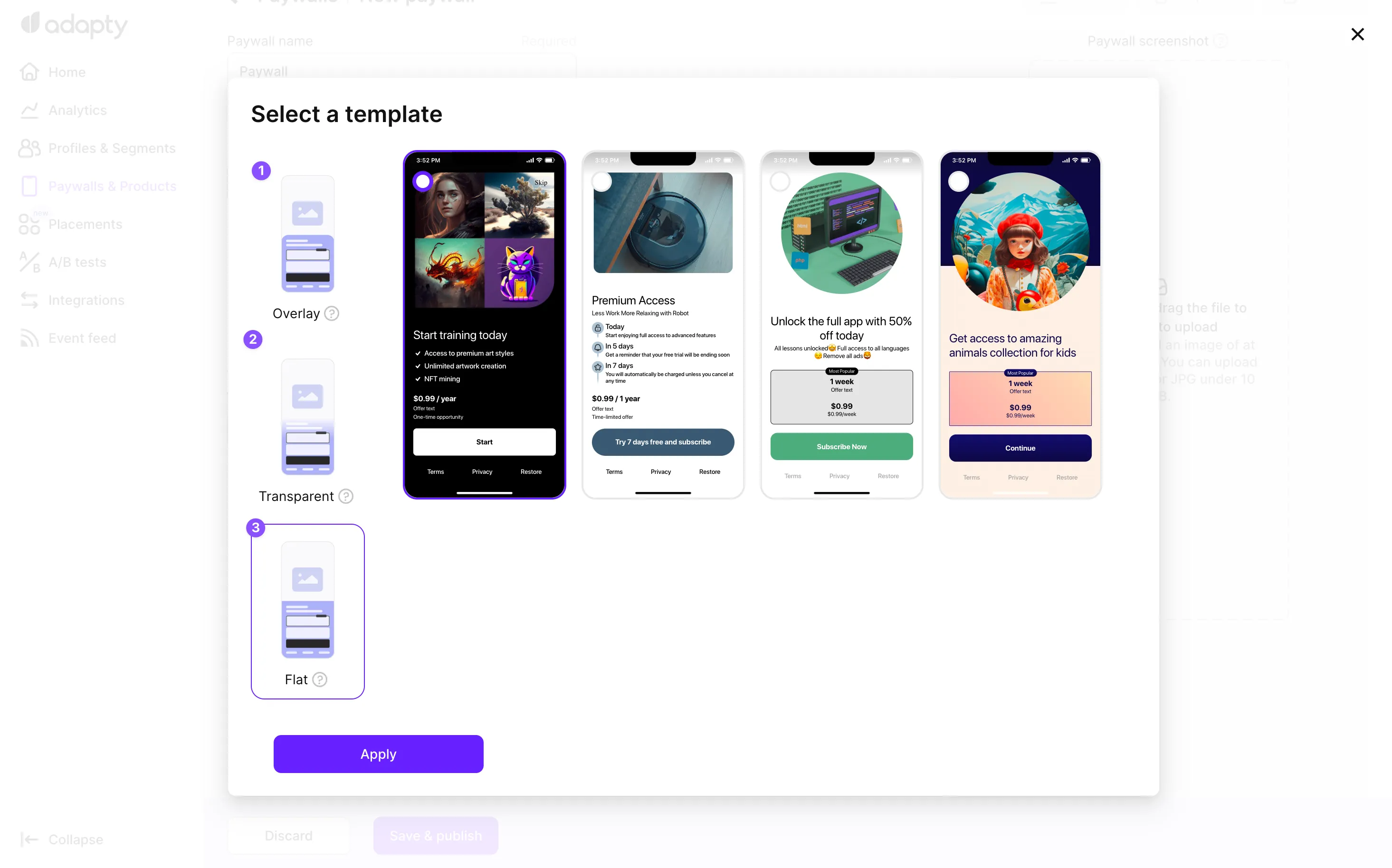 When creating or editing paywalls using Adapty's Paywall Builder, you have the flexibility to choose from three distinct layout options, each with its own corresponding templates. The template layout you select will dictate the visual appearance and user experience of the paywall in your iOS or Android app. Let's explore the three available template layout options: