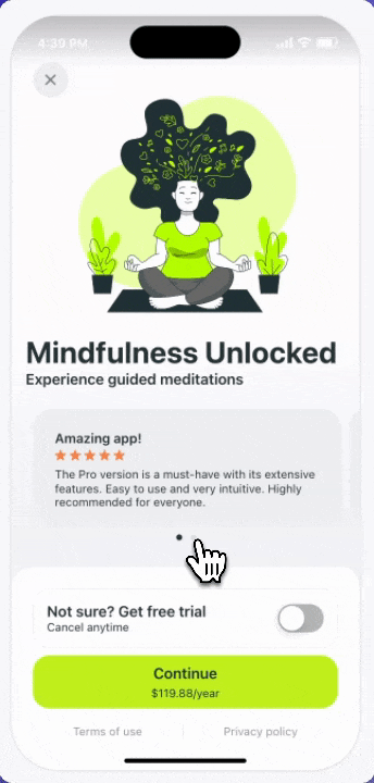 A carousel is a dynamic set of swipeable cards that can be moved left or right, creating a captivating visual experience. It's a fantastic tool to craft paywalls that not only draw attention but also engage users with interactive content.