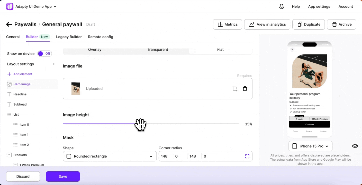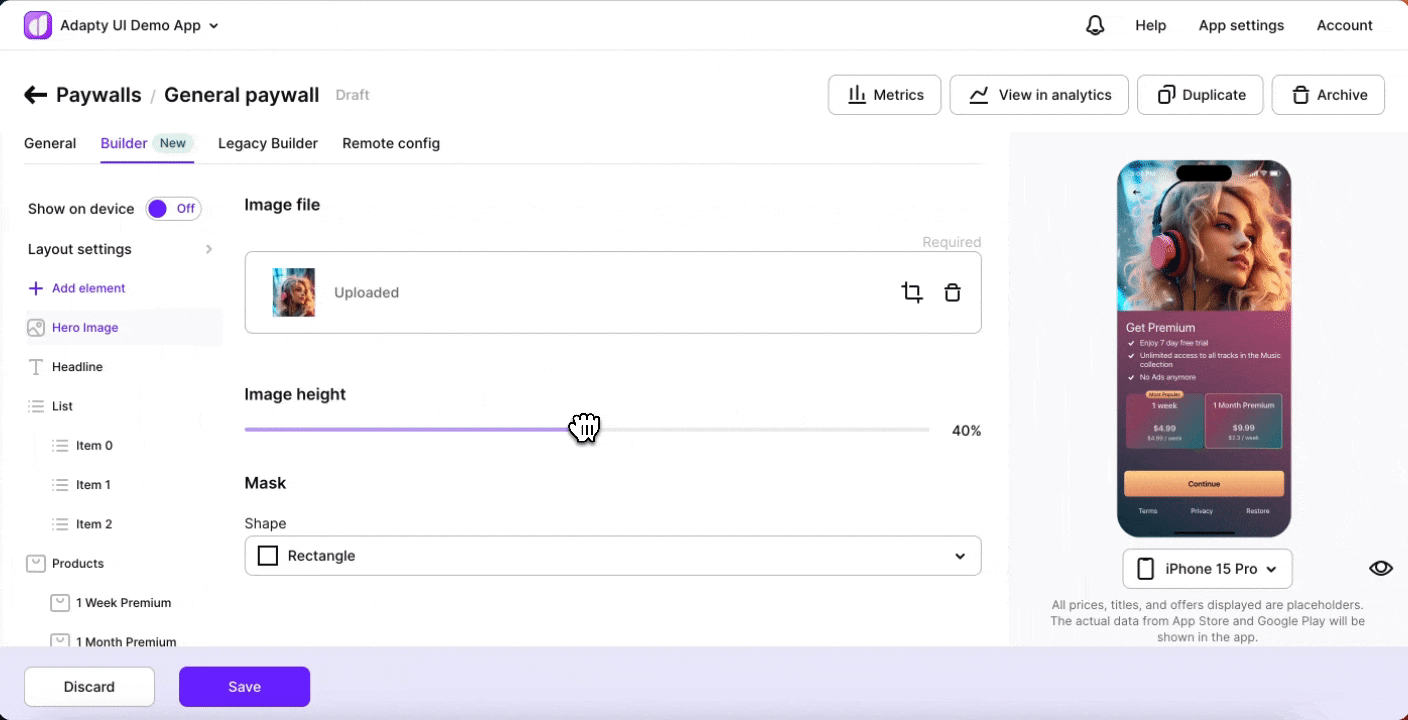 You have control over the sizing of the main image, adjusting its proportions to achieve the desired visual balance on your paywall. Specify the image size as a percentage of the total screen area for perfect alignment.