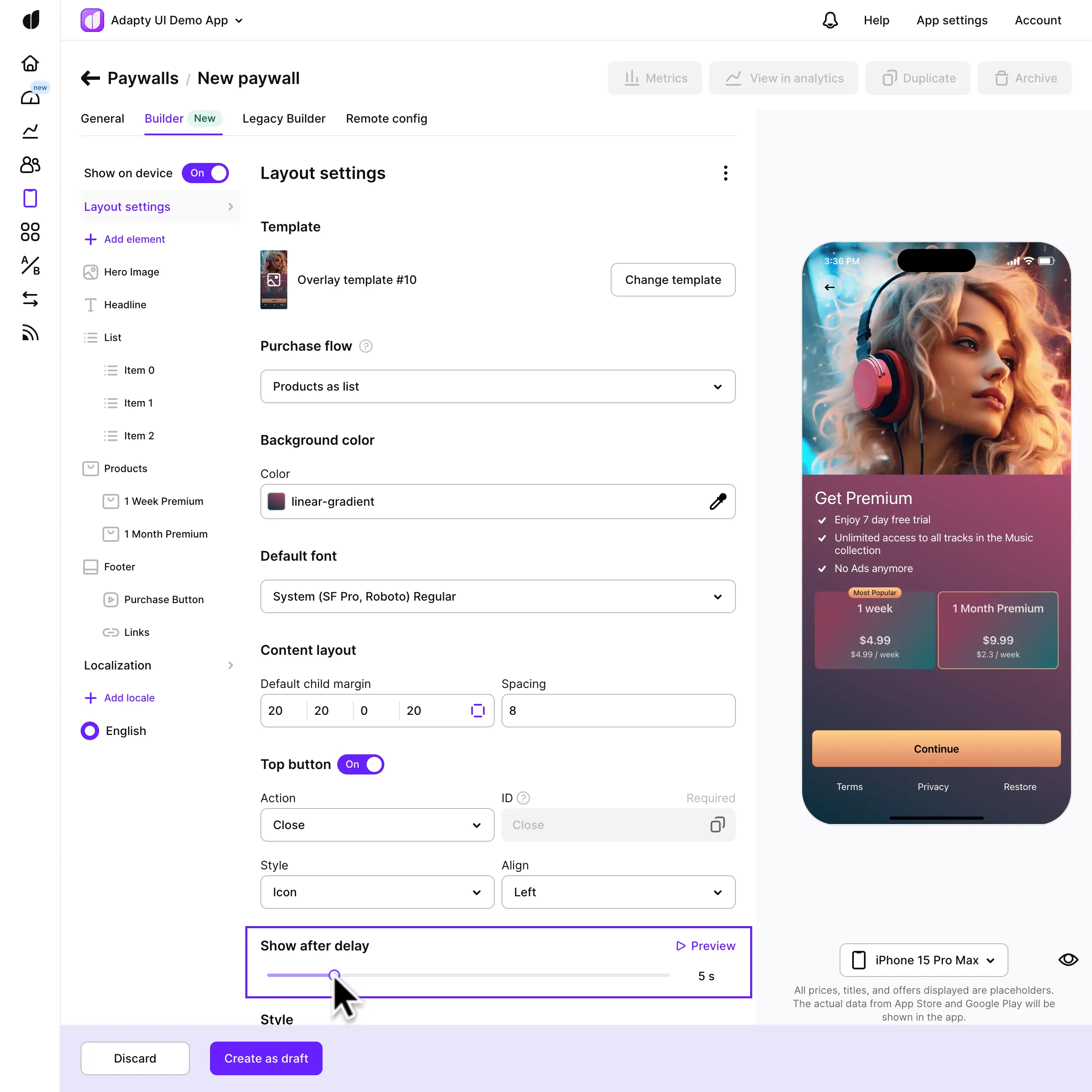 After selecting a template for your paywall in Adapty's Paywall Builder, you can customize the paywall's visual appearance to match your brand's style. The Layout settings provide a variety of controls for adjusting the layout, background, and overall look of the paywall. Let's explore these settings: The layout settings control the basic aspects of the paywall, including the template, background color, default fonts, purchase flow, and top buttons.