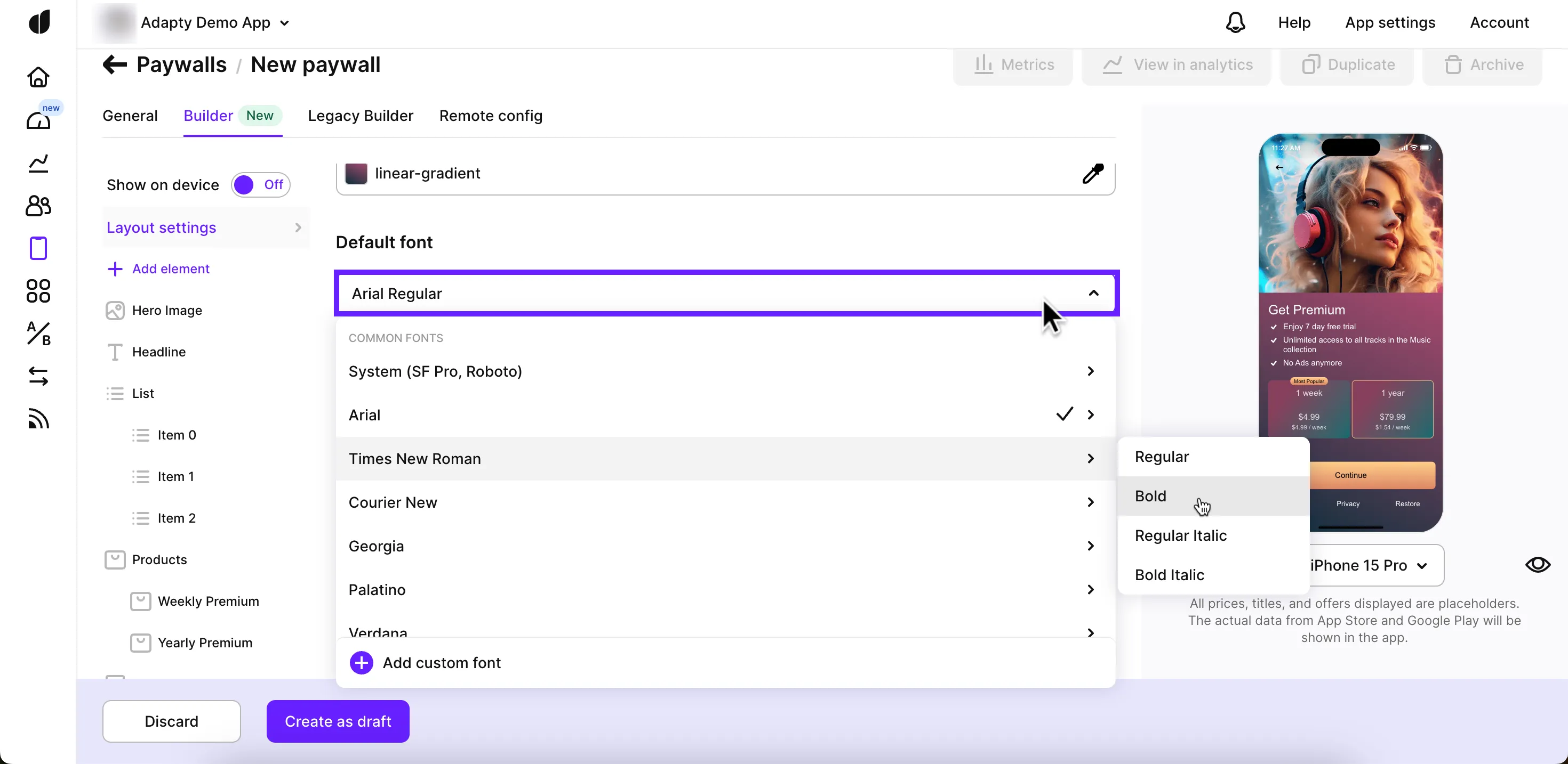Font settings in the Layout settings apply to all paywall components by default. You can override these settings for specific elements, such as text boxes or lists, when editing those elements individually. If you change the default font in the Layout settings, it will not affect elements with individual fonts. Learn how to upload a custom font here.