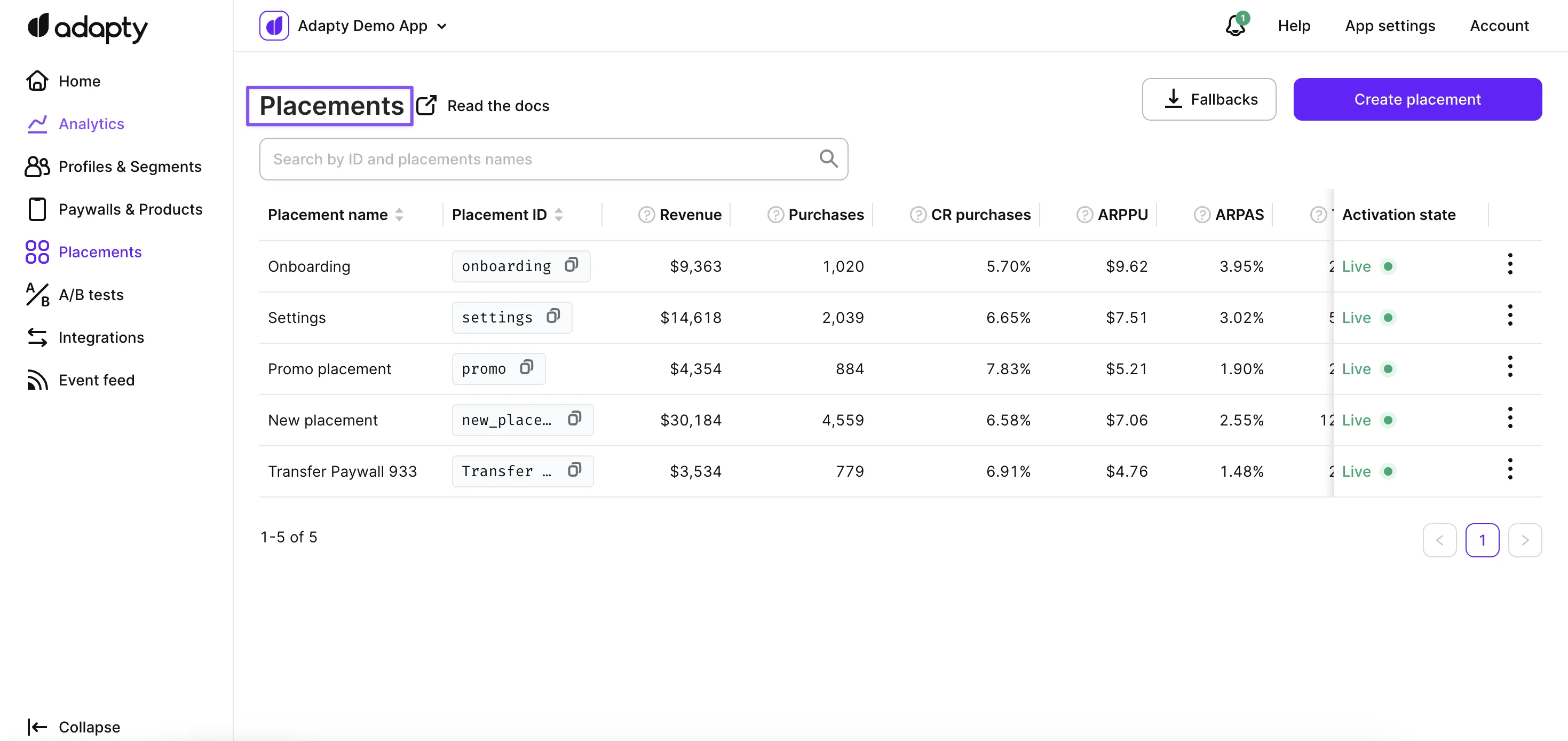 To see the list of placements in Adapty, open the Placements section in the Adapty main menu.