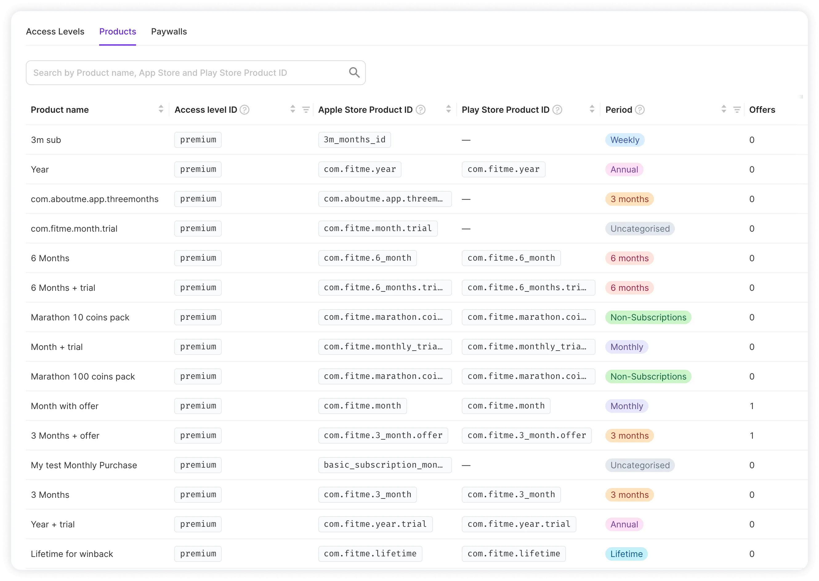 After you create products in the Adapty Dashboard, they are visible in the Products tab of the Paywalls and Products section.