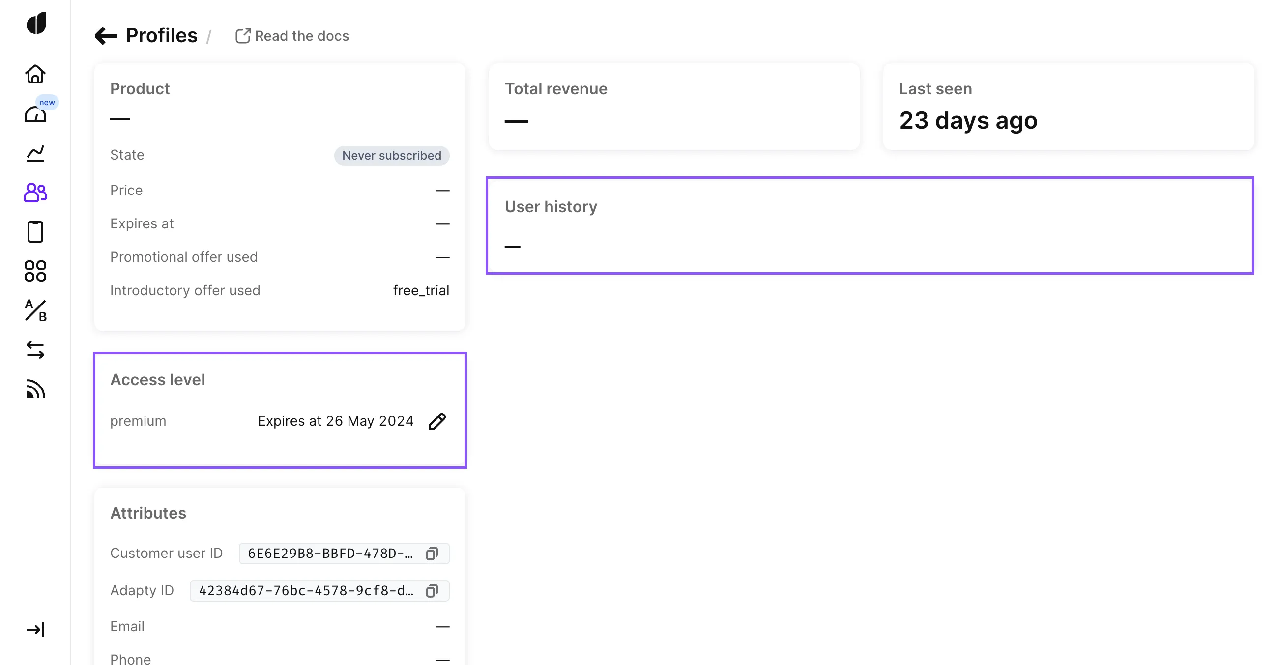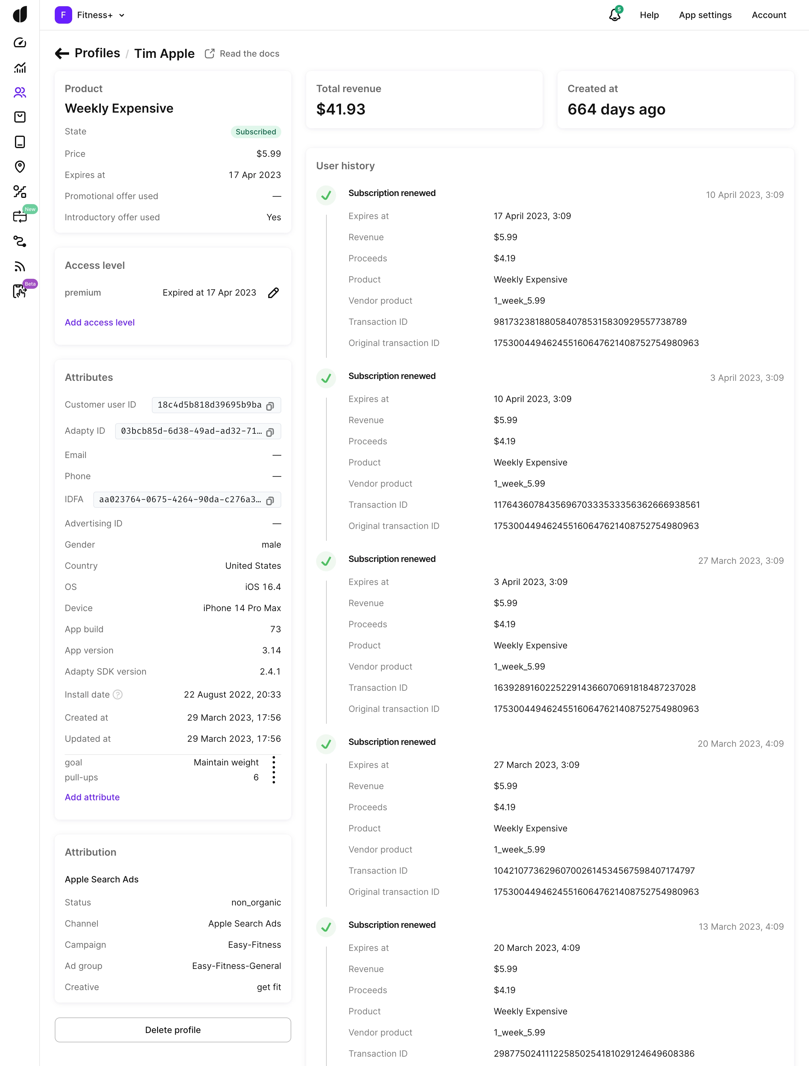 After installing SDK, Adapty automatically collects user events from the payment queue and displays them in a user profile.