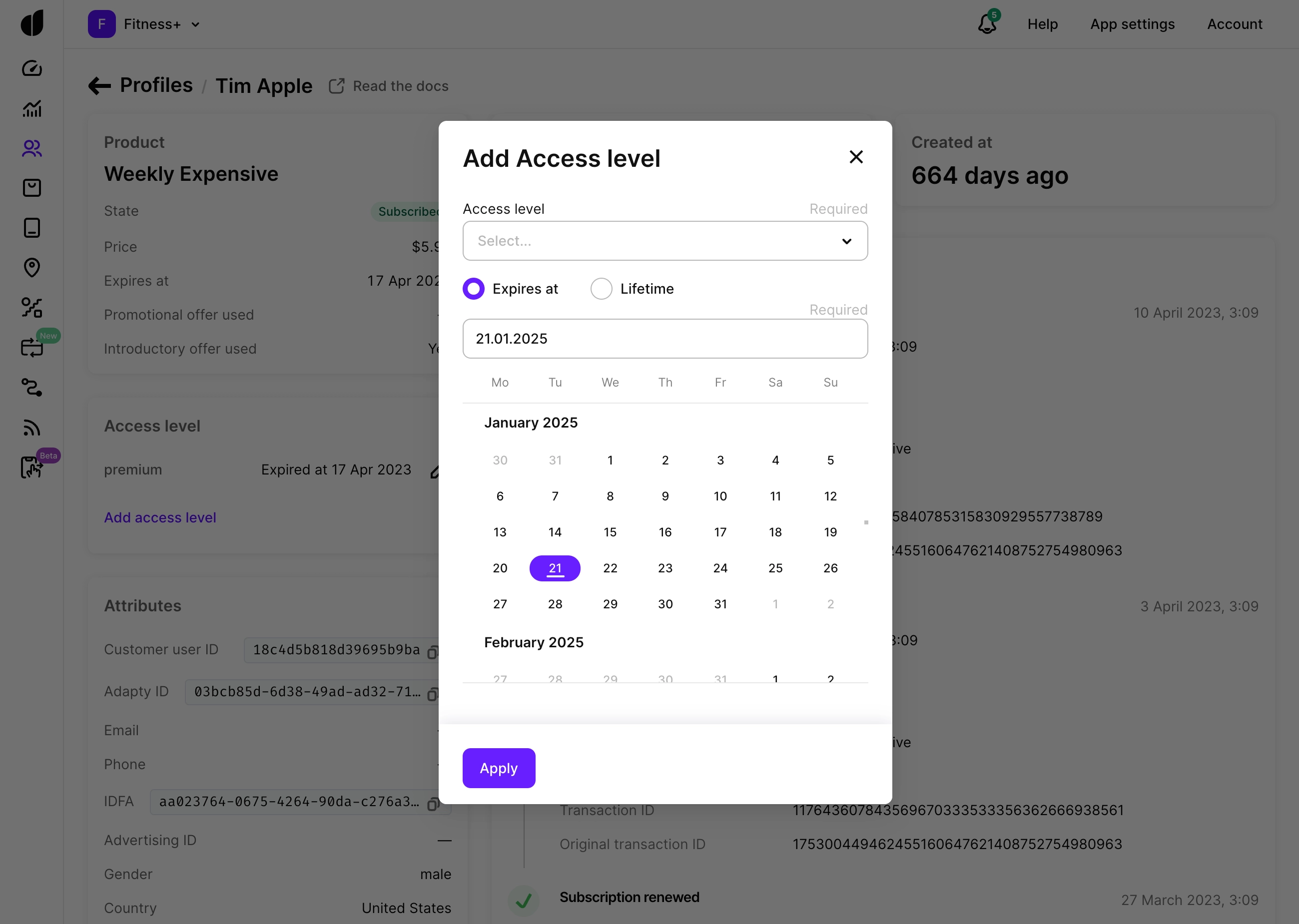 In a profile, you can find an active subscription. At any time you can prolong the user's subscription or grant lifetime access.