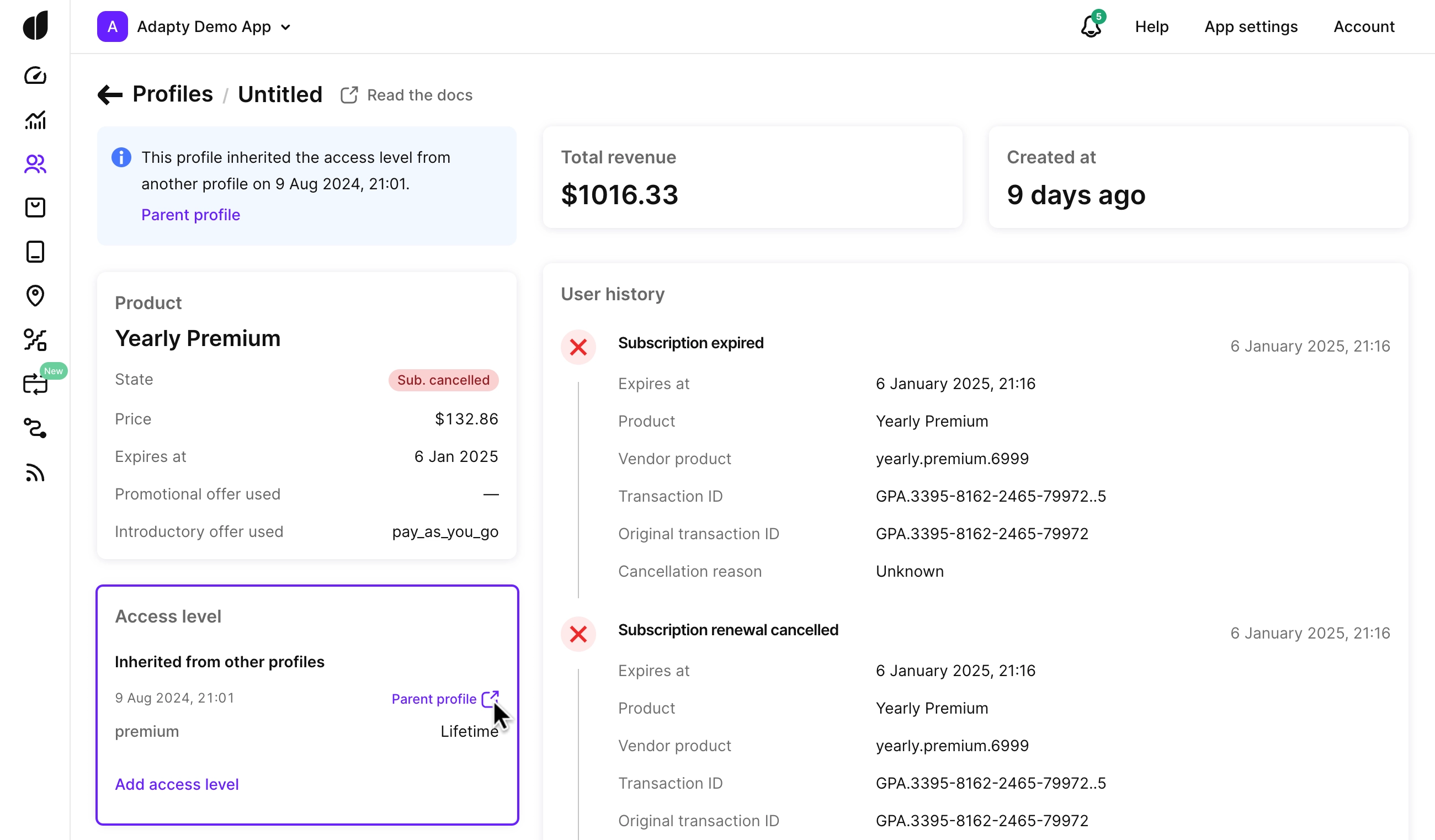 This means that a user who installs, then uninstalls, and reinstalls your app may have several profile records in Adapty if no customer user ID is used. All transactions in a chain are tied to the profile that generated the first transaction — the "original" profile. This helps keep a complete transaction history — including trial periods, subscription purchases, renewals, and more, linked to the same profile.