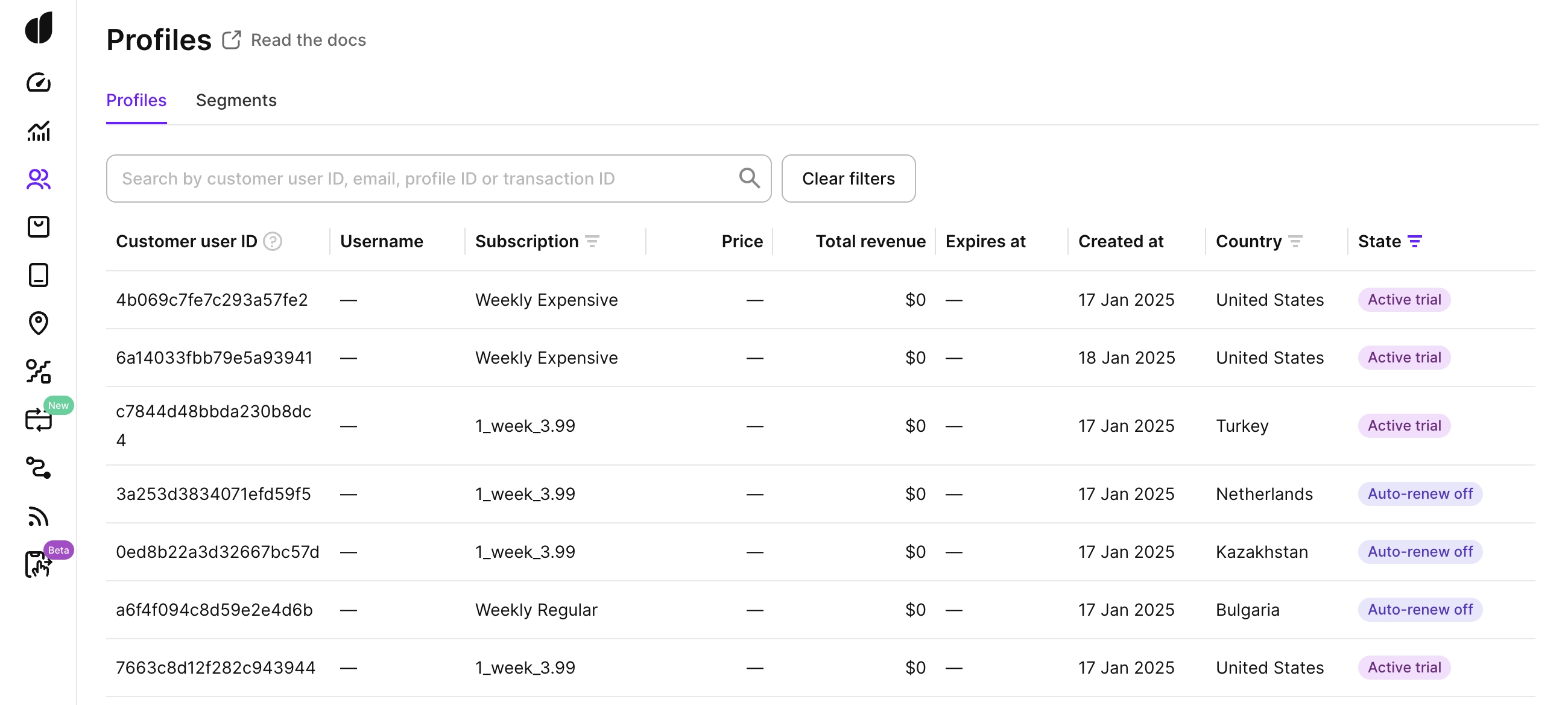 - Analyze user's properties such as subscription state, total revenue/proceeds, last seen, and more.
