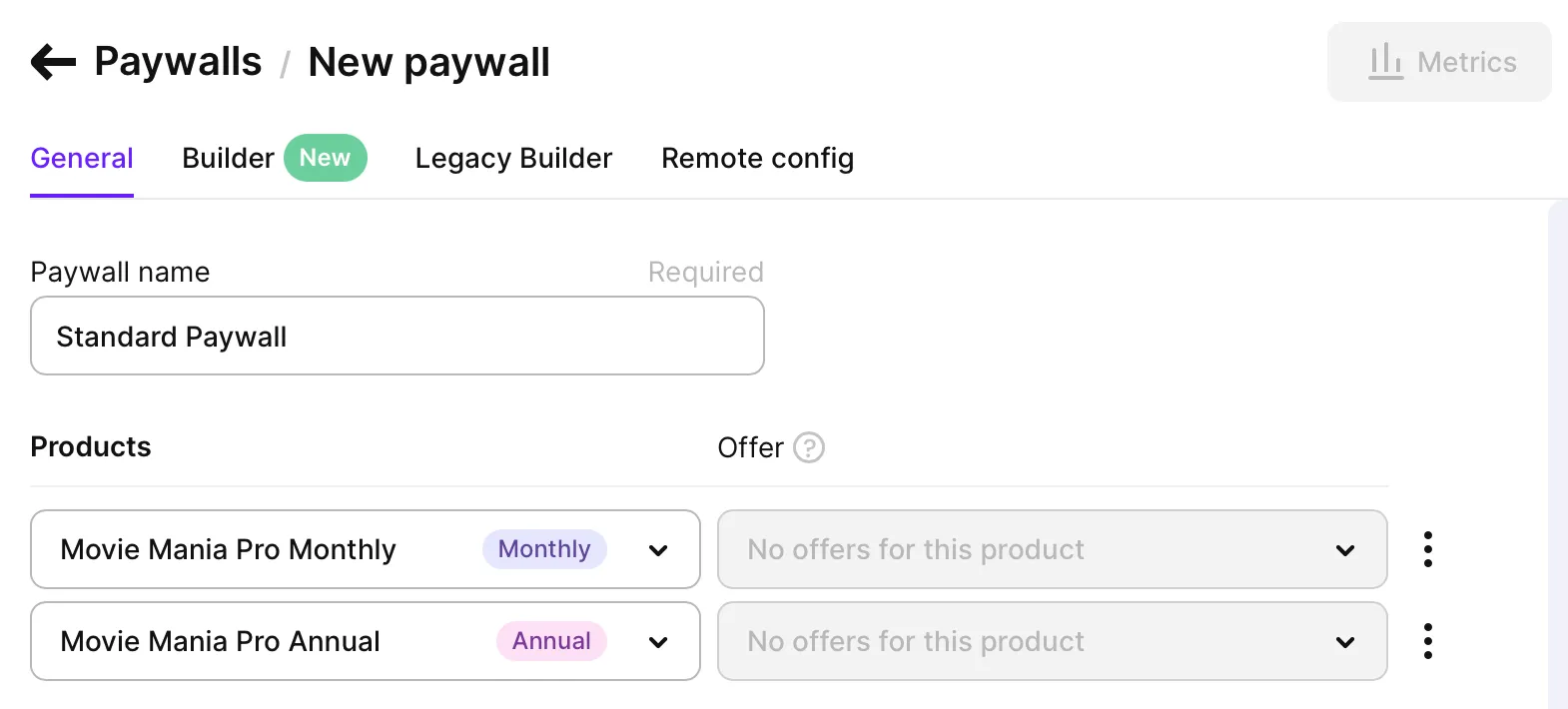 Click on Paywalls in the left-side navigation, and create a new paywall using the button in the upper right.