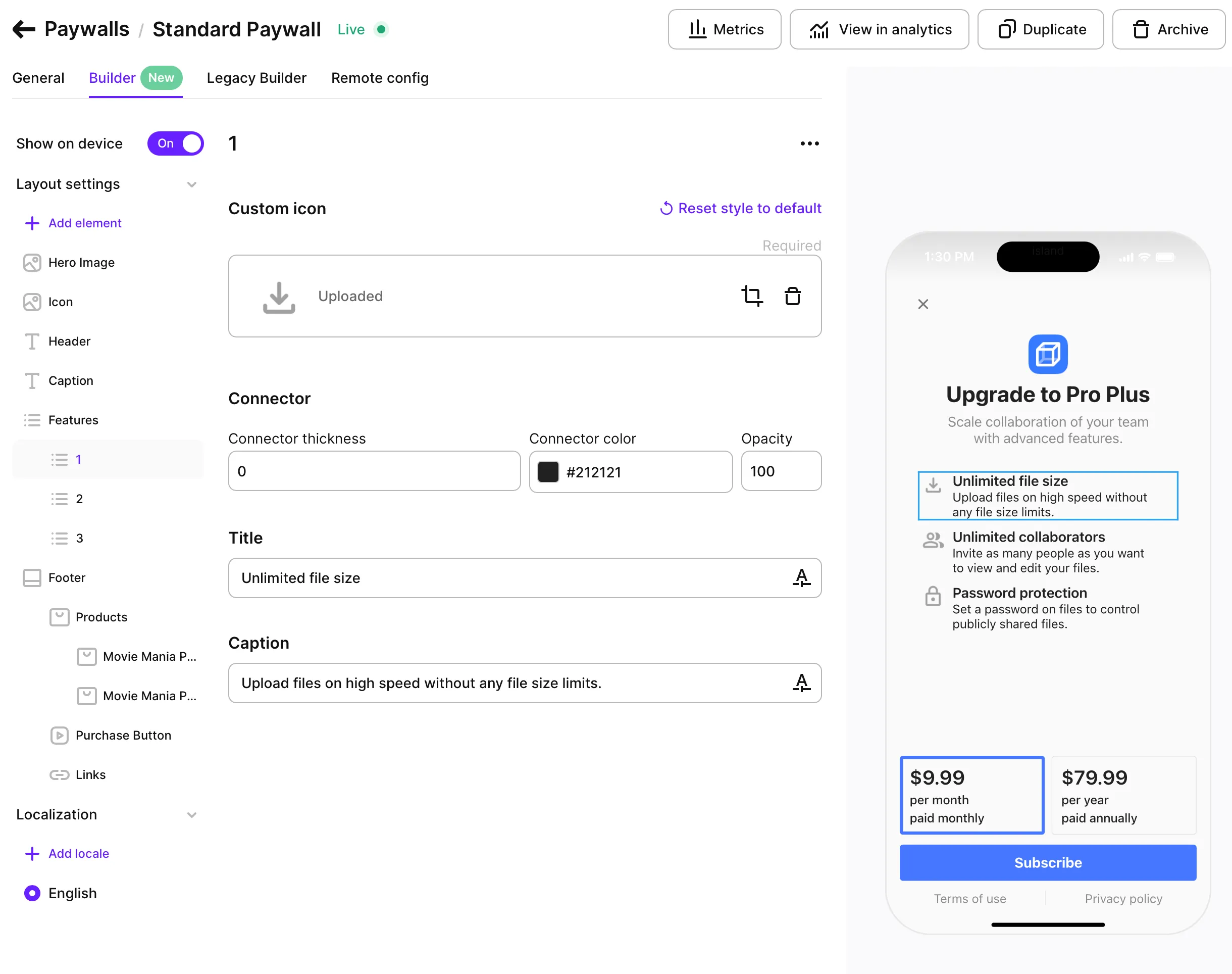 - Verify that the paywall appears when triggered.