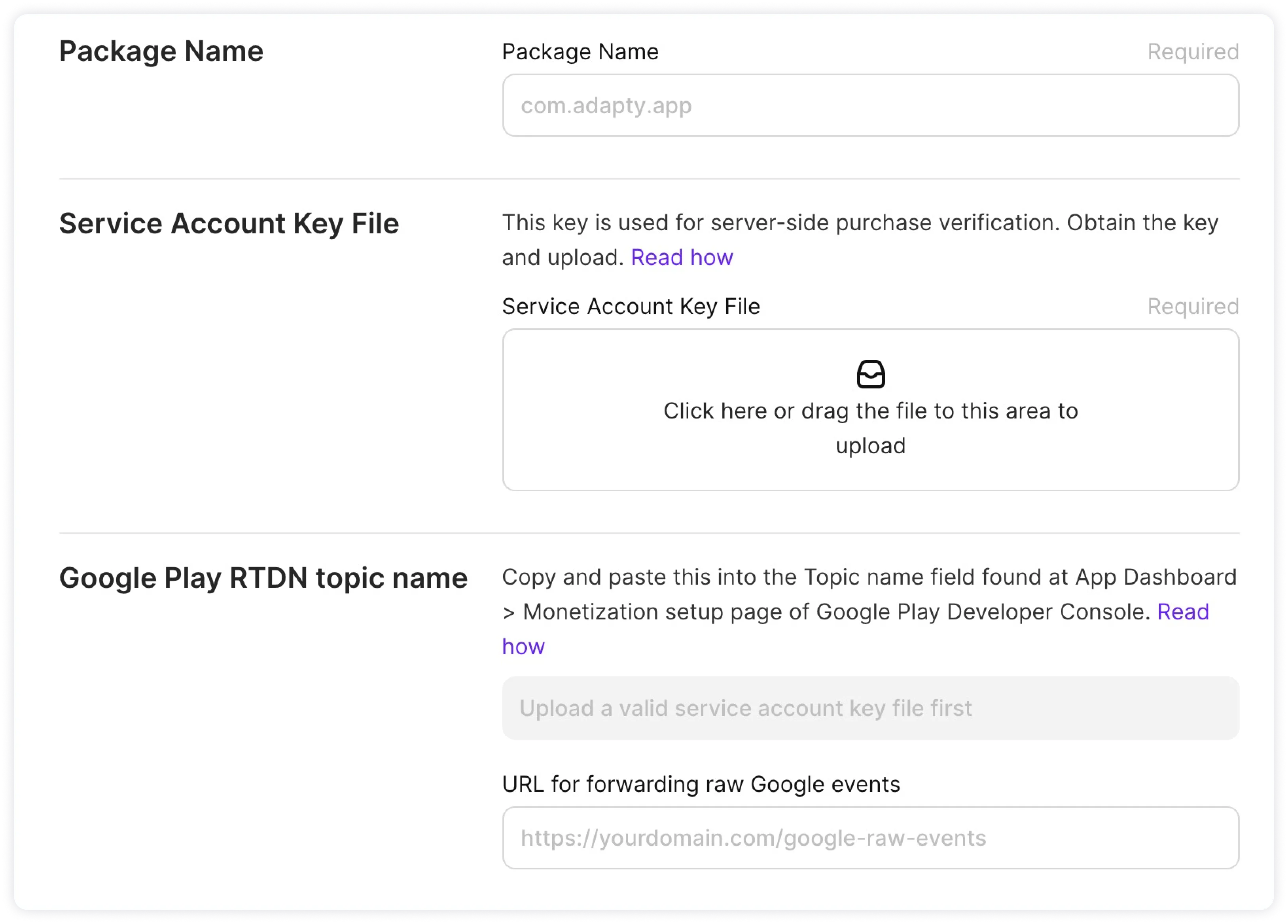 - In Adapty Dashboard, go to App settings→ Android SDK and fill in the fields.