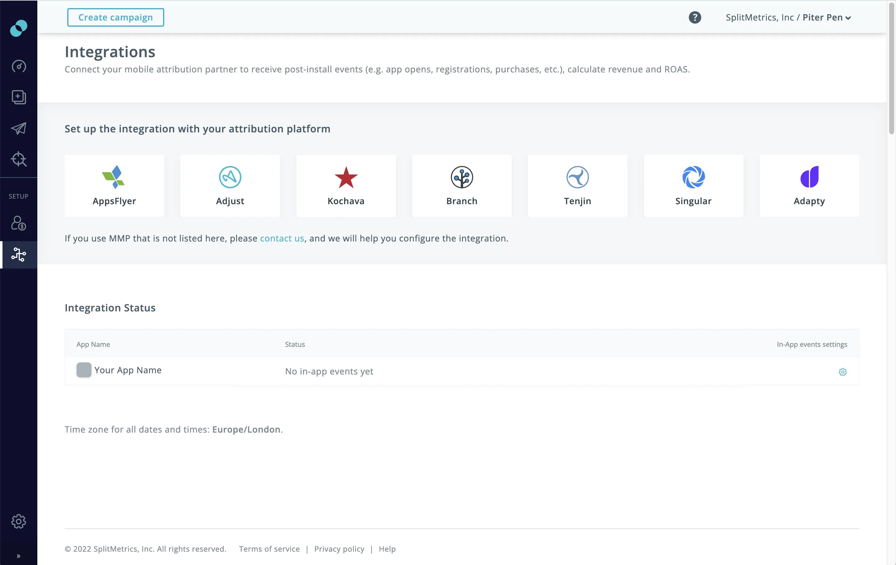 To integrate SplitMetrics Acquire go to Integrations > SplitMetrics Acquire and set credentials.