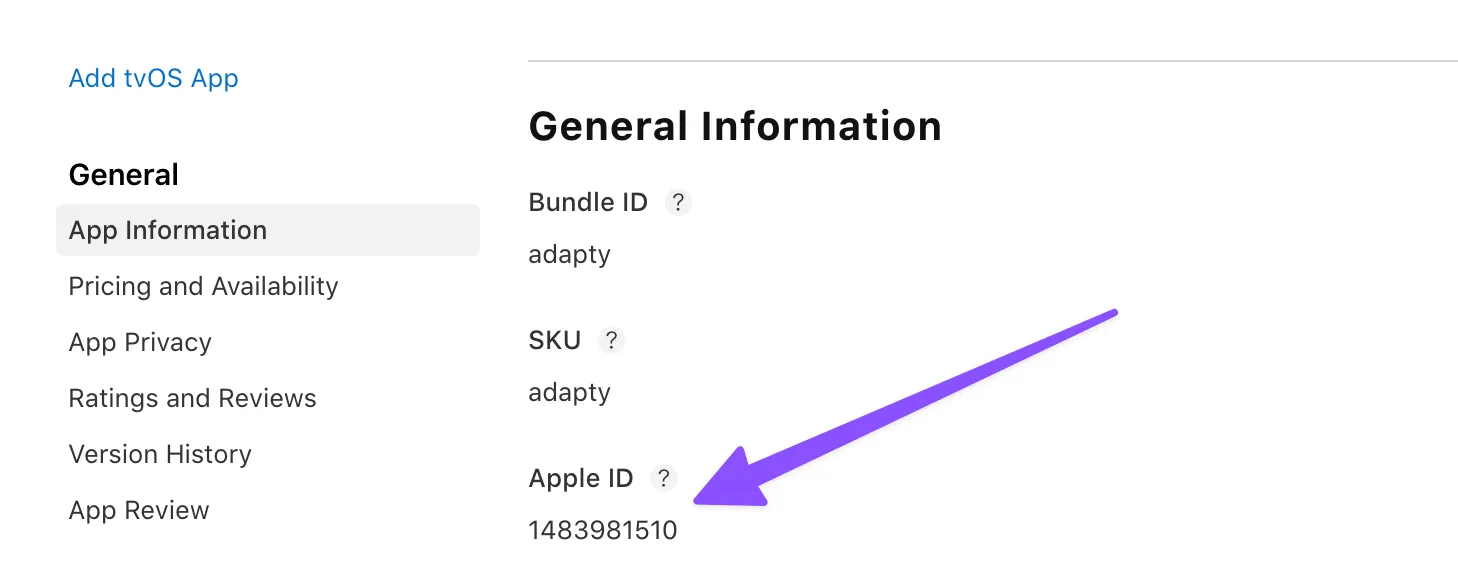 You will also have to set Apple App ID to use the integration. To find your App ID, open your app page in App Store Connect, go to the App Information page in the General section, and find the Apple ID in the left bottom part of the screen.