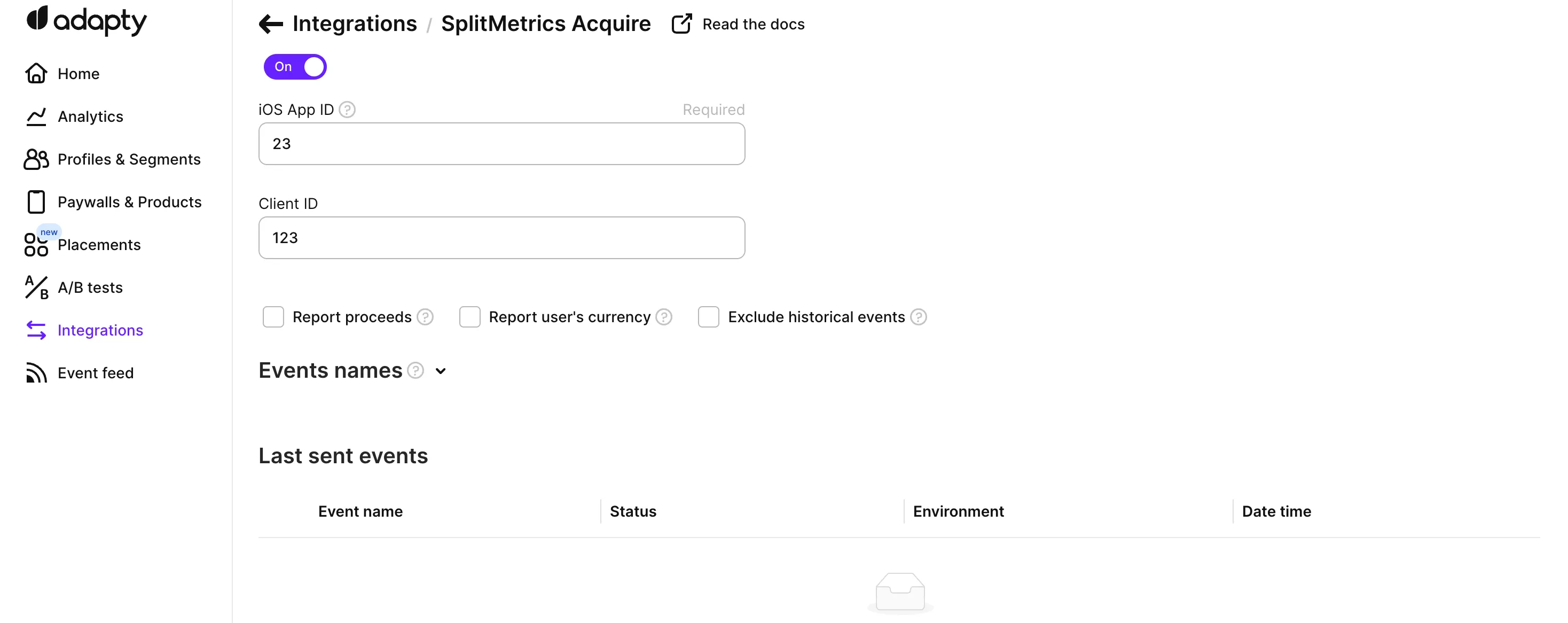 Below the credentials, there are three groups of events you can send to SplitMetrics Acquire from Adapty. Simply turn on the ones you need. Check the full list of the events offered by Adapty here.