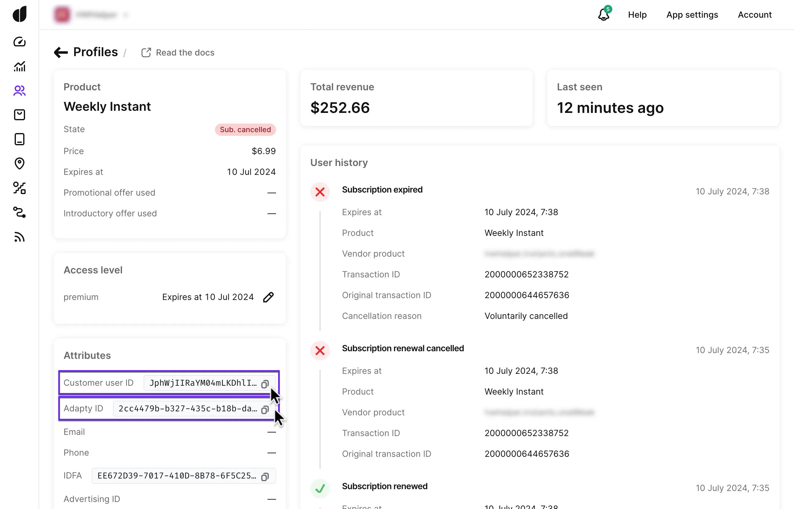 Copy Customer user ID and Adapty ID field values in the profile details: