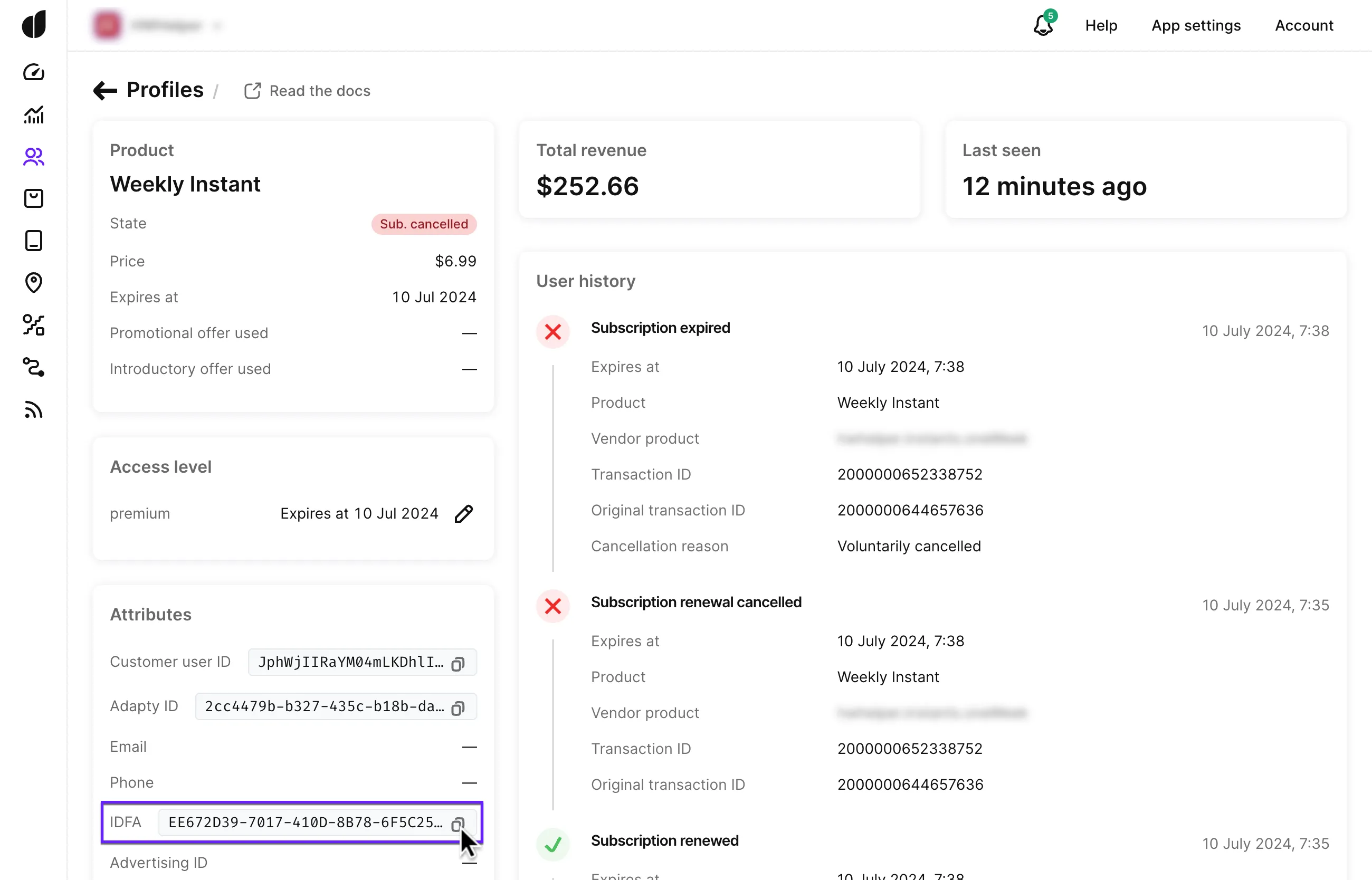 - Open the profile details and copy the IDFA field value in the Attributes section: