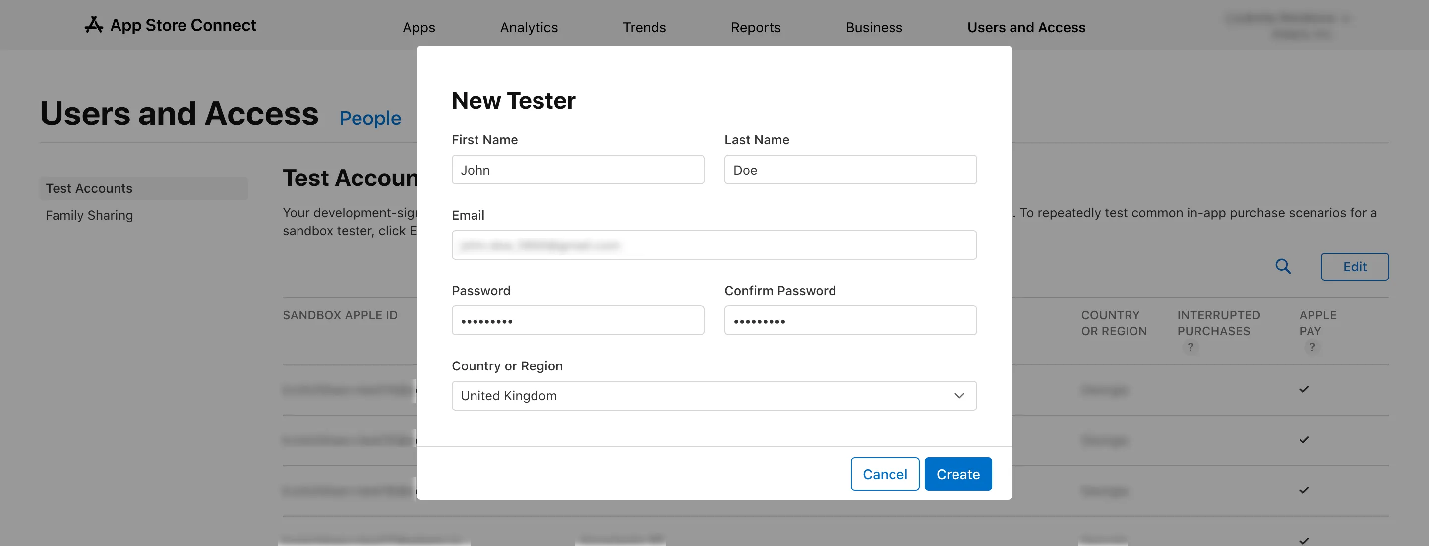 Open App Store Connect. Proceed to Users and Access → Sandbox → Test Accounts section.