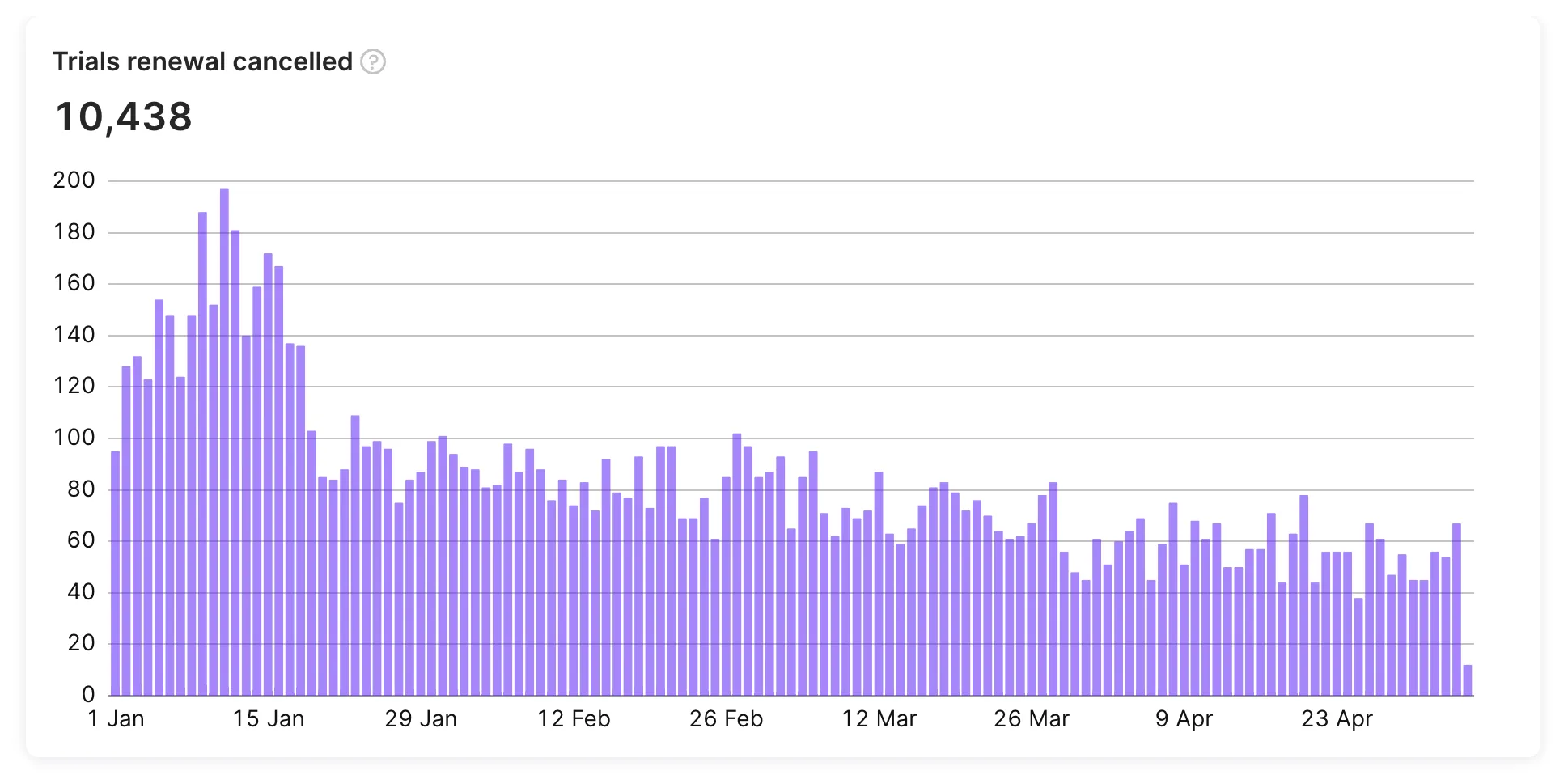 The Trials renewal cancelled chart displays the number of trials with canceled renewal (cancelled by user). When the renewal for the trial is disabled, this means that this trial won't be automatically converted to a paid subscription, yet the user still has premium features of the app until the end of the current period.