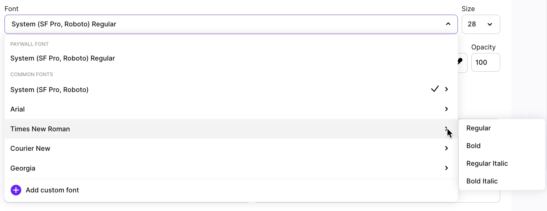 When you create a paywall in the Builder, Adapty uses a system font by default. This usually means SF Pro on iOS and Roboto on Android, though it can vary depending on the device. You can also choose from commonly used fonts like Arial, Times New Roman, Courier New, Georgia, Palatino, and Verdana. Each of these fonts comes with a few style options: